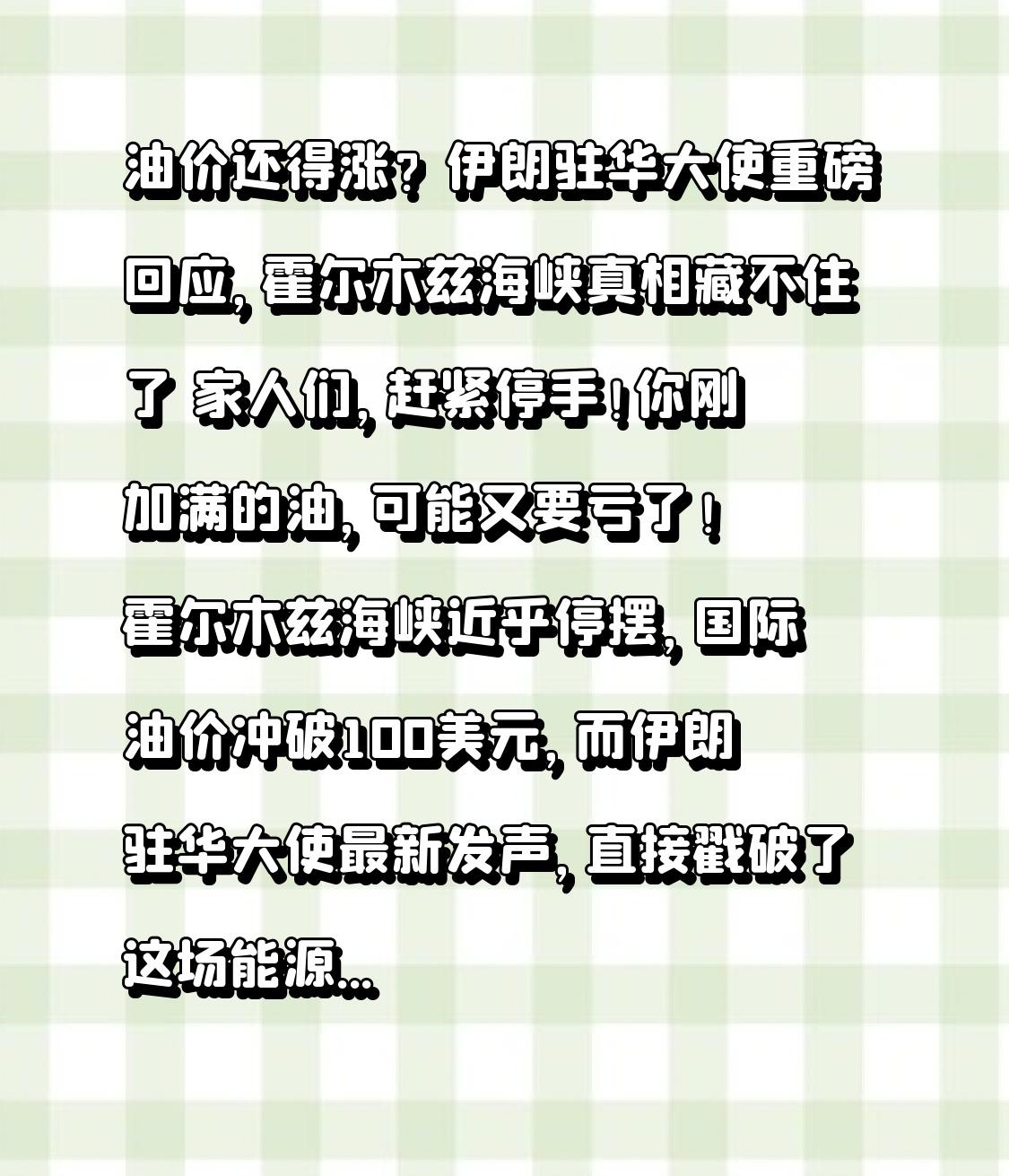 油价还得涨?伊朗驻华大使重磅回应,霍尔木兹海峡真相藏不住了 家人们,赶紧停手!你刚加满的油,可能又要亏了!霍尔木兹海峡近乎停摆,国际油价冲破100美元,而伊朗驻华大使最新发声,直接戳破了这场能源危机的核心真相 ! 就在昨天,伊朗驻华大使法兹里在北京召开记者会,一句话震惊全场:“伊朗一贯保障霍尔木兹海峡通行安全,美国才是地区不安全的来源!” 这话一出,全网炸锅——毕竟这条狭窄水道,承载着全球五分之一的海运石油,咱们国内油价四连涨,根源就在这儿 ! 很多人以为,伊朗要彻底封锁海峡?这就是最大的误读!大使明确澄清:伊朗不会封闭海峡,但若安全得不到保障,将对通行进行管制 。截至3月9日,波斯湾已有411艘油轮滞留,伊拉克油田产量暴跌70%,全球原油供应缺口直逼千万桶。这不是伊朗的“封锁”,而是美以袭击后,航运公司集体停航的无奈结果。 更关键的是,大使还发出重磅警告:美国可能攻击船只嫁祸伊朗,试图把其他中东国家拖下水 。要知道,2月28日美以突袭伊朗后,已有多艘油轮在海峡遇袭,这波油价暴涨,本质是地缘冲突的连锁反应 。 转折点来了!这场危机,普通人真的只能被动挨宰吗?其实不然。大使的表态传递出明确信号:地区安全才是油价稳定的关键,而中国一直站在和平一边,呼吁通过对话解决争端。对咱们来说,除了精打细算出行,更要明白——国际风云的每一个变化,都在影响咱们柴米油盐的开销。 有人说,这只是遥远的中东冲突,和我无关?大错特错!物流成本飙升,菜市场的青菜在涨价,快递费在上涨,就连网约车起步价都可能悄悄上调。全球能源的“咽喉”被扼住,没有一个普通人能独善其身。 最后想说:油价涨跌的背后,是大国博弈的棋局,更是普通人的生活重量。我们盼着海峡恢复畅通,盼着油价回归理性,更盼着世界和平,让每一个为生活奔波的人,都能少一点压力,多一点安稳。 认同的点赞转发,让更多人看到这场能源危机的真相,愿和平早日降临,愿咱们的钱包不再为油价提心吊胆!