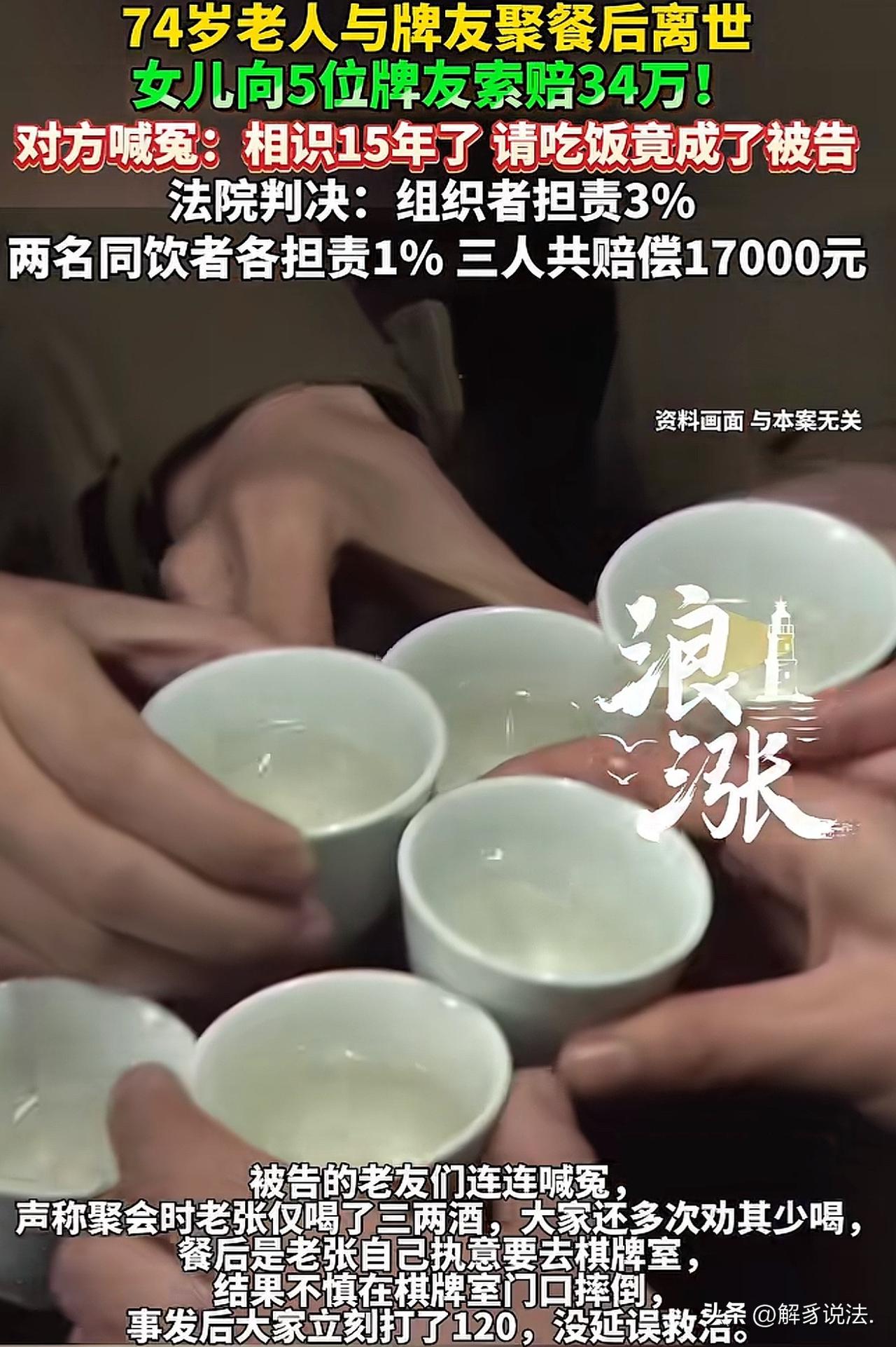 上海,74岁老汉到牌友家中聚餐,席间,5位牌友均与老汉相识已有15年,感情非常好,几人共饮了一瓶白酒。完事后,有人提议去玩几 把,大家一拍即合,老汉也跟着去了。谁知,刚走到棋牌室门口,老汉脚下一滑,摔倒在地。几人见状吓坏了,赶紧叫了救护车,并将其送往医院。最终,抢救无效,不幸离世。事后,老汉女儿认为,如果父亲不去参加聚餐,人还活的好好的!一气之下,将5位牌友告上法庭,索赔34万元。牌友委屈的说:我好心好意请他吃饭,每次来都热情招待,吃了还被你告!法院调查后,发现这样一细节,判决很意外。 2026年3月9日,上海奉贤法院对一起因老友聚餐饮酒引发的意外身亡案件作出了判决,这件事在当地引起了不少人的关注。 张先生的女儿得知父亲突然离世的消息时,悲痛欲绝,几乎崩溃。在她眼里,父亲虽然已经已经74岁,平时身体硬朗,精神状态一直很好,能吃能走,根本看不出有什么大毛病。 就是一场普通的老友酒局,人说没就没了,这让她无论如何都接受不了。 一想到父亲是在醉酒后没人照顾才摔倒出事,她心里又痛又气,认为同桌喝酒的几个人都有责任,于是一气之下将5名一同饮酒的牌友告上了法庭,要求他们赔偿34万元,为父亲的离世讨一个说法。 事情还要回到2024年3月的那一天。张先生和几位牌友已经相识十五年,关系一直不错。 当天他特意赶到奉贤去看望老朋友,作为牌友之一的赵女士十分热情,专门在家设宴招待。 几位老人凑在一起格外开心,边吃边聊,气氛十分热闹,席间大家共饮一瓶白酒,聊得十分尽兴。 酒足饭饱之后,张先生说什么也不肯直接回家,执意要跟着大家一起去棋牌室坐一坐,几位老友也没过多阻拦,便一同陪着他前往。 可谁也没有想到,意外就在这一刻发生了。一行人走到棋牌室门口时,本就喝了不少酒的张先生脚步已经有些不稳,晃晃悠悠的,身边也没有人及时上前搀扶。 就在这时,他脚下一滑,重重地摔倒在了地上,当场就失去了意识。 同行的几个人见状吓了一跳,赶紧上前查看,随后拨打了急救电话。救护车赶到后,将张先生送往医院抢救,一路上也耽误了不少时间,可最终张先生还是因为急性硬膜下血肿,经抢救无效不幸离世。 得知结果后,张先生的女儿更加认定,是这几位牌友没有尽到照顾义务。 她认为,父亲醉酒后,大家不仅没有安全送他回家,反而带他去棋牌室,摔倒后也没能第一时间妥善处理,耽误了最佳抢救时间,这才造成了无法挽回的后果。 而被告的5位老人心里也满是委屈,觉得自己好心没好报。 赵女士更是无奈地表示,自己只是好心招待老朋友,热情款待、一起吃饭喝酒,从来没有强行劝酒。 大伙一起要送他回家,可是他半路不肯回家,非要去棋牌室看看,并非大家强迫。 出事后,他们也第一时间叫了救护车,全力配合送医,根本不存在故意拖延抢救的情况。 自己一片好心招待老友,最后反倒被告上法庭,实在让人寒心。 法院经过现场勘查和仔细审理后发现,作为聚会组织者的赵女士,竟然连张先生的家庭住址都不清楚,所谓要送他回家的说法根本不成立。 而张先生醉酒后走路不稳,同行的几人也没有尽到足够的看护和护送责任,存在一定的疏忽。 《民法典》第1165规定:行为人因过错侵害他人民事权益造成损害的,应当承担侵权责任。共同饮酒人因先行饮酒行为,对醉酒者负有提醒、照顾、护送的安全注意义务,未尽到义务造成损害的,应承担相应责任。 最终法院判决,聚会组织者赵女士承担3%的赔偿责任。 另外两名一同饮酒并前往棋牌室的老人各承担1%的责任,三人一共赔偿17000元。 其余只是单纯陪同饮酒的人员无需承担责任。 欢迎关注@解豸说法.
