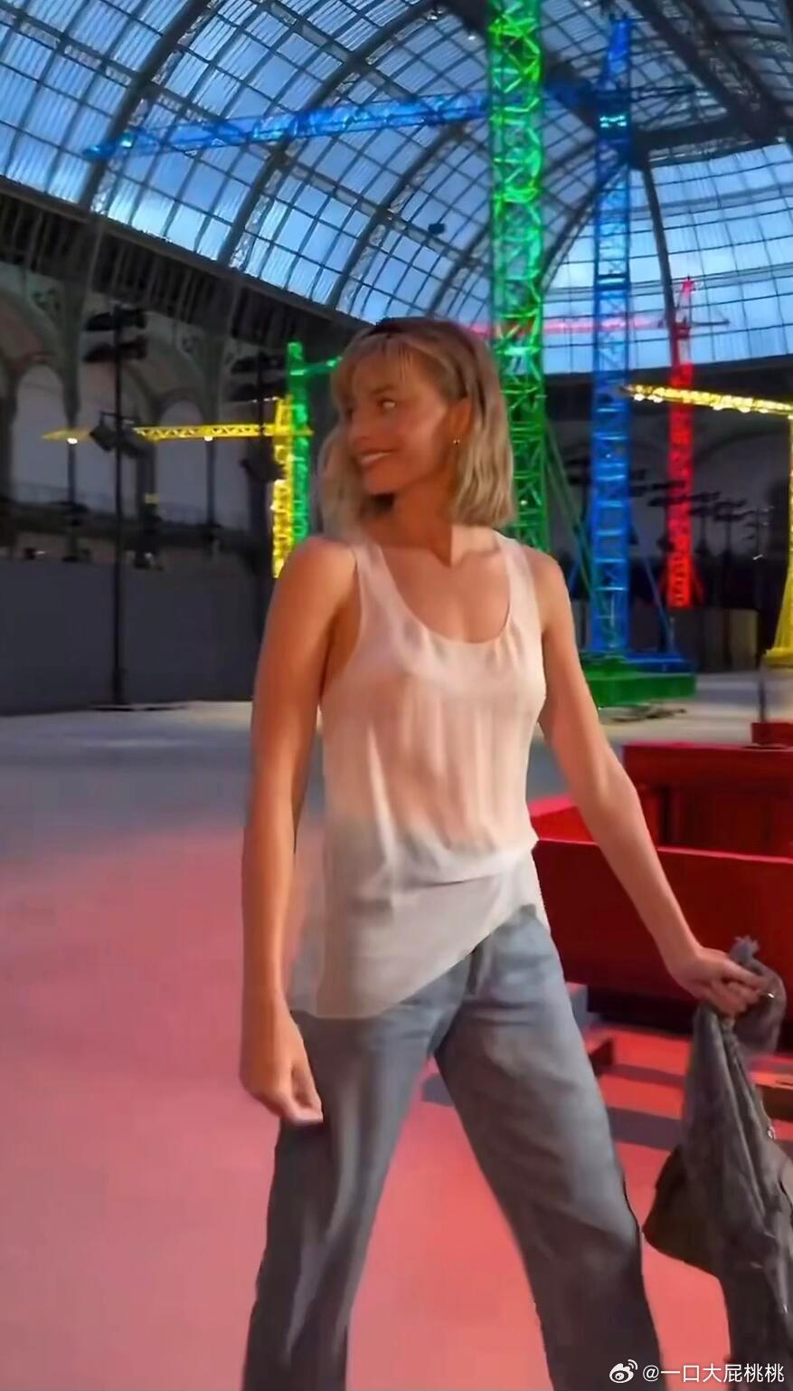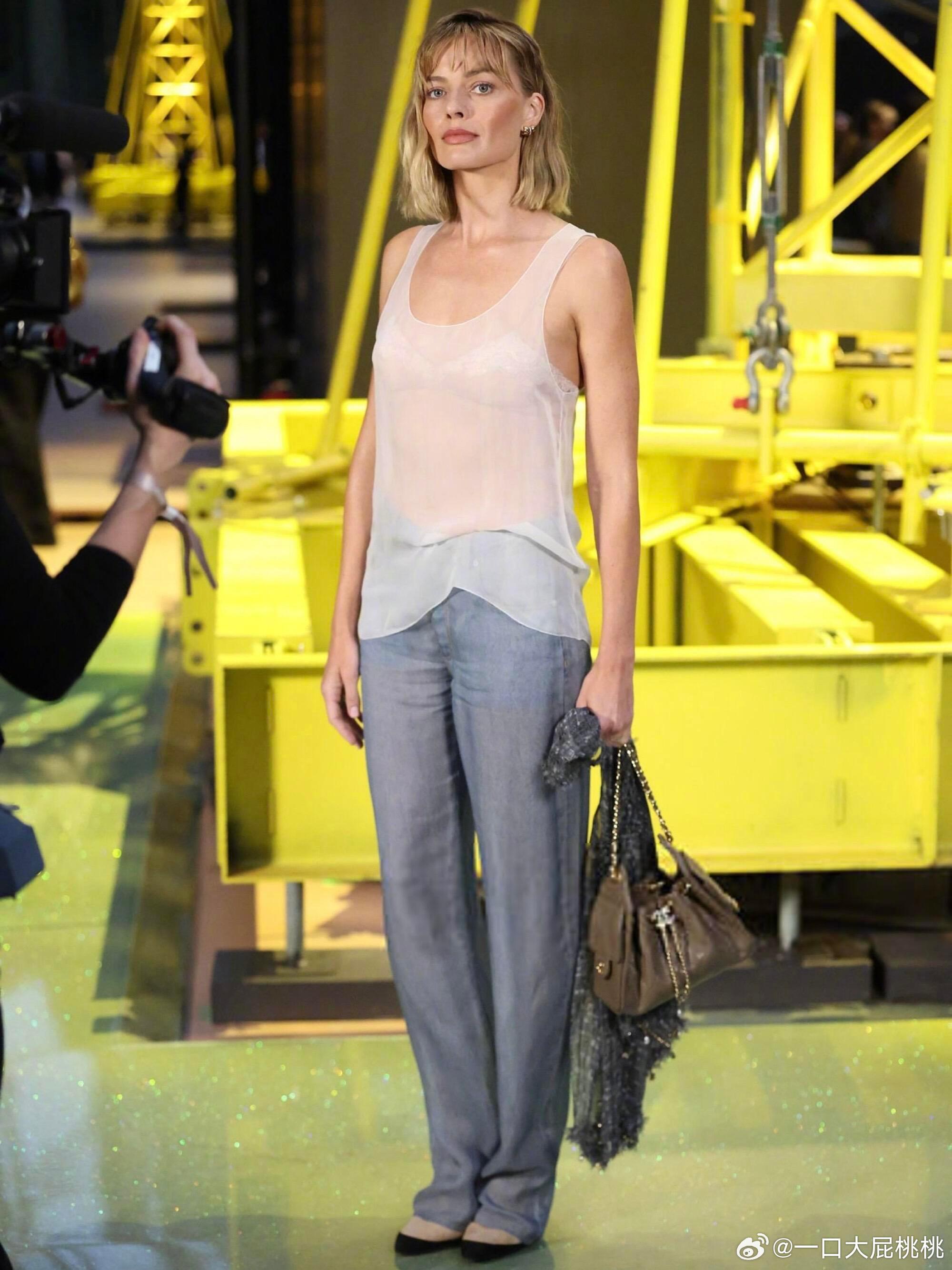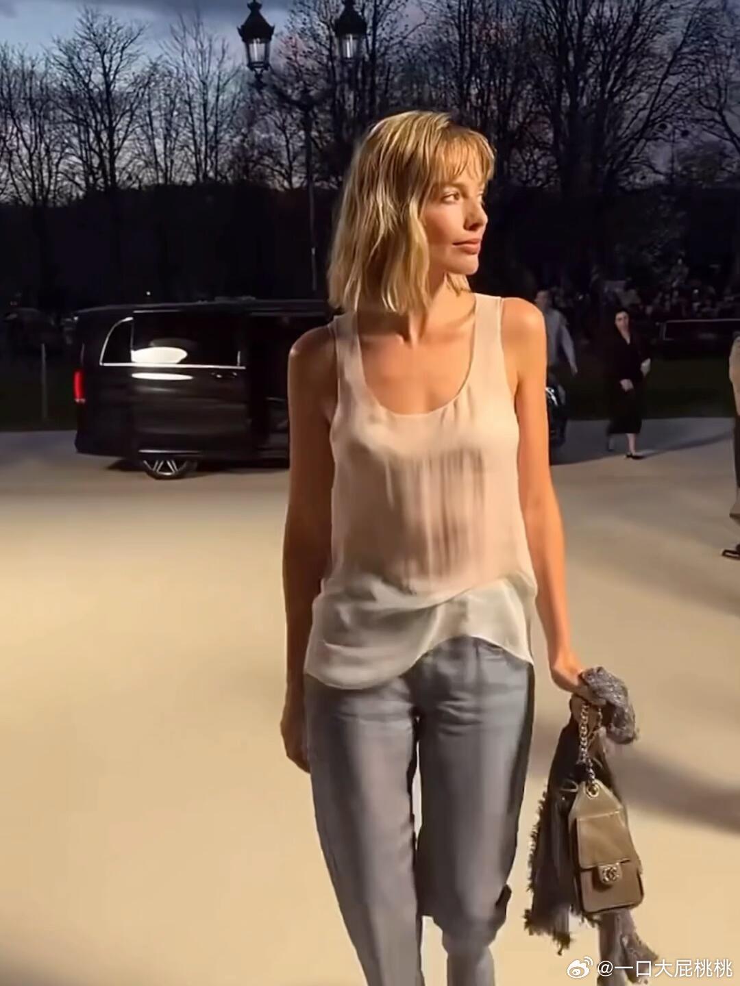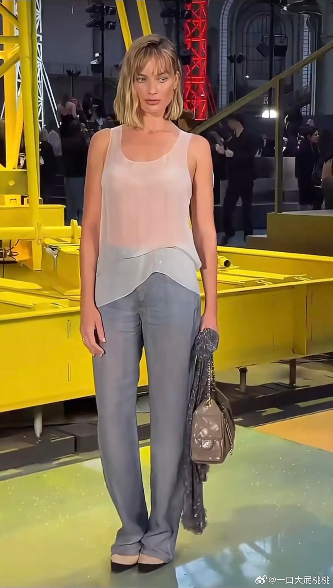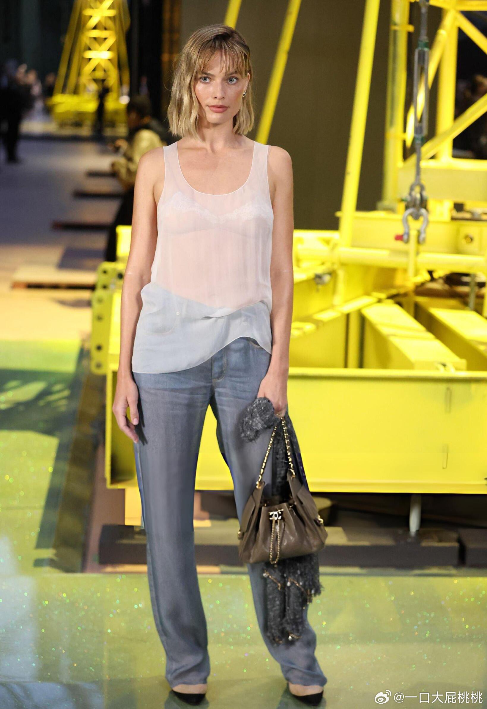 罗比穿着 Matthieu Blazy 首季 CHANEL 高定,透感无袖上衣配仿牛仔裤亮相香奈儿大秀!能把香高定穿的这么轻盈也就罗比了,这是真时髦!