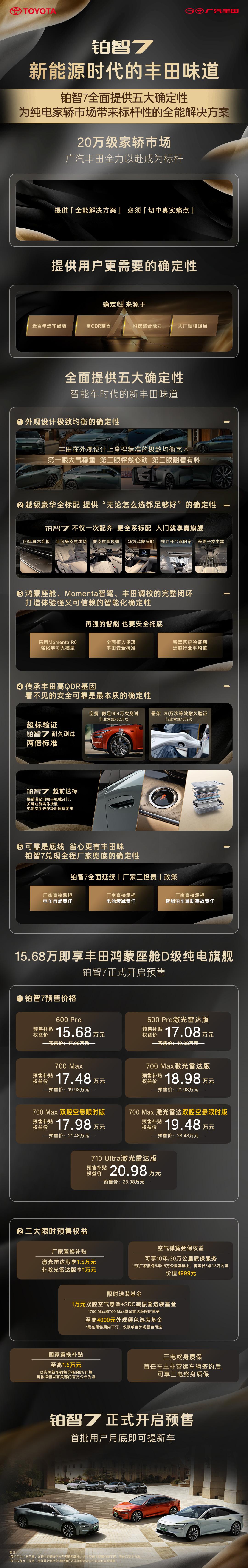 丰田铂智7实车到店,这价值感让新势力紧张了 广汽丰田铂智7近日全面登陆全国门店,15.68万元起的预售价配上全系标配的华为鸿蒙座舱、NAPPA真皮座椅,让不少进店用户直呼“超预期”。 现场最吸睛的是限时权益叠加后的价格:带激光雷达和双腔空气悬架的版本不到18万就能拿下,厂家还把空气弹簧质保延长到10年/30万公里,智能泊车出事直接担责。这种配置和保障力度,放在20万级纯电市场里确实能打。 凭借成熟的供应链体系和耐用口碑,广汽丰田这次在智电赛道拿出了真本事。首批用户月底即可提车,这波“闭眼入”的节奏稳了。