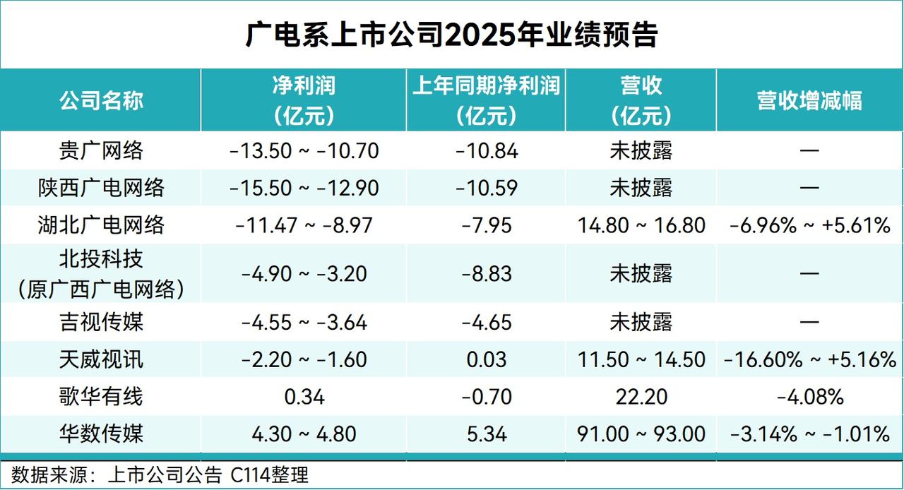 【八家广电系上市公司:六家亏损 两家盈利】 日前,国内八家广电系上市公司2025年业绩预告相继出炉,行业整体承压态势明显。数据显示,仅有华数传媒与歌华有线两家实现盈利,其余六家均陷入亏损泥潭。 受用户流失、ARPU值下降及市场竞争加剧影响,传统有线电视业务持续萎缩,成为拖累业绩的主因。与此同时,固定资产折旧、财务费用及信用减值损失等刚性成本居高不下,进一步挤压利润空间。尽管部分公司已布局5G、AI智能体等新业务,但短期内难以完全对冲主业下滑的影响。 亏损企业中,贵广网络与陕西广电网络亏损额居前,预计净利润下限分别达-13.5亿元和-15.5亿元,亏损幅度同比扩大。 而华数传媒虽受视听业务收入下降拖累,净利润同比预减10%至19%,但仍实现4.3亿至4.8亿元盈利;歌华有线则凭借投资收益及资产处置收益大增,成功扭亏为盈,预计净利润约0.34亿元。