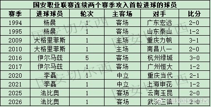 【国安职业联赛连续两个赛季攻入首粒进球的球员】