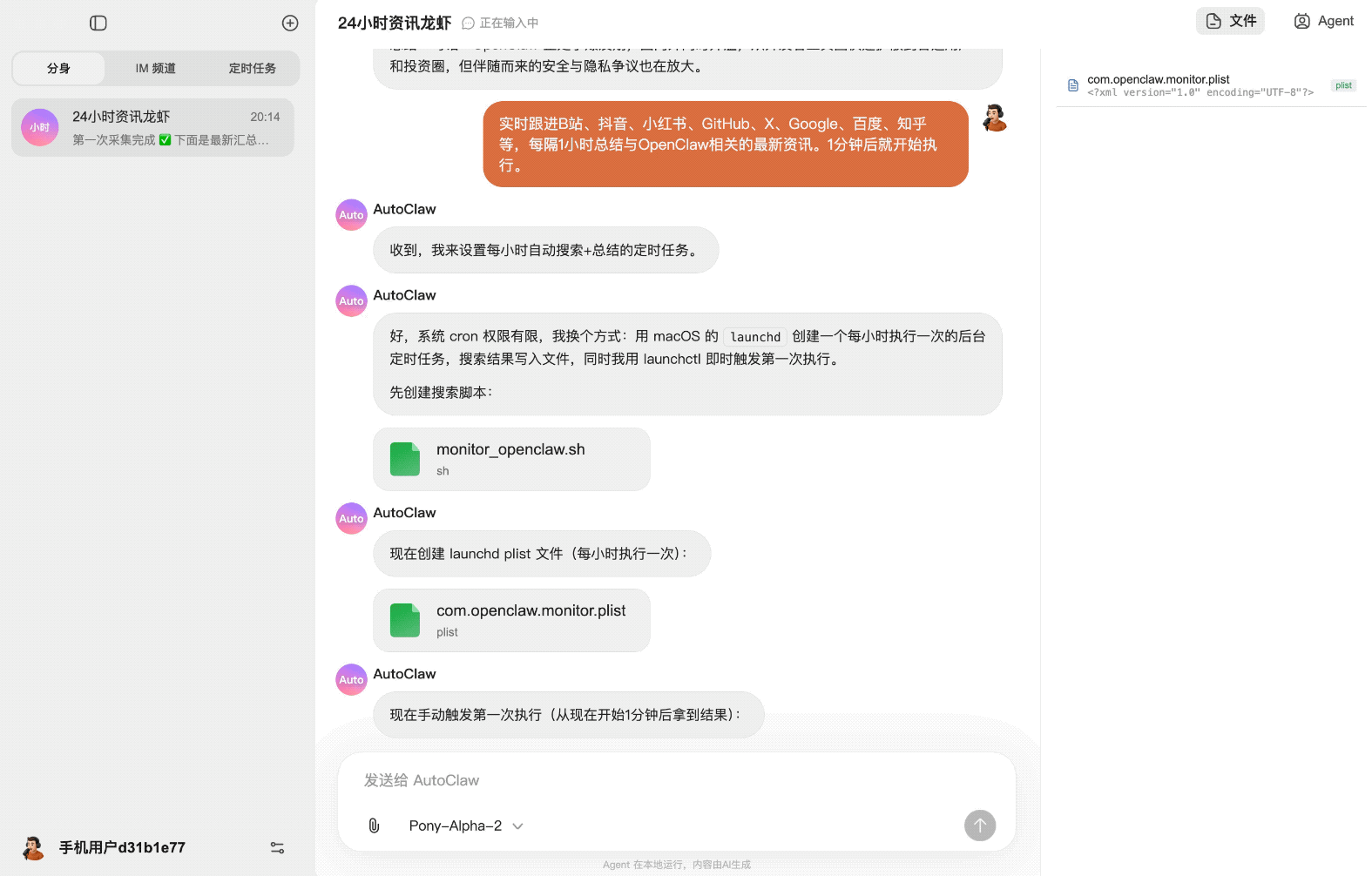 我们直接一句简单的Prompt:实时跟进B站、抖音、小红书、GitHub、X、Google、百度、知乎等,每隔1小时总结与OpenClaw相关的最新资讯。1分钟后就开始执行。【图2】