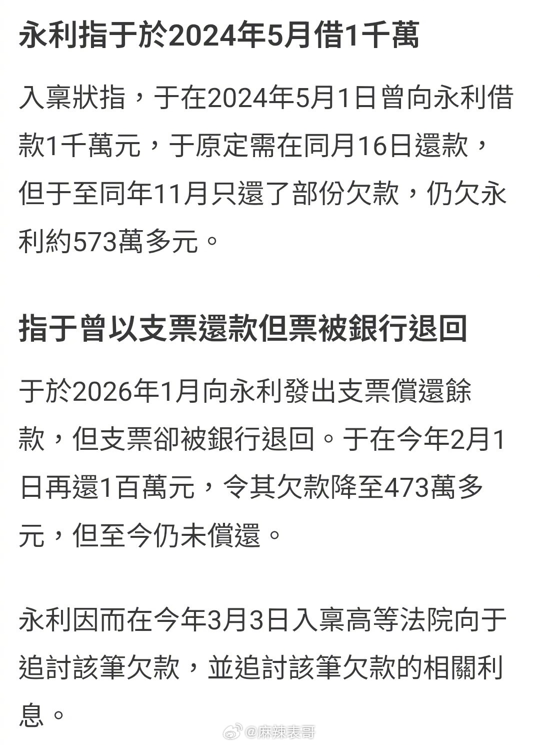于冬被曝欠赌债未还,新闻说2024年借了1000万,后来还剩下573万。1月的时