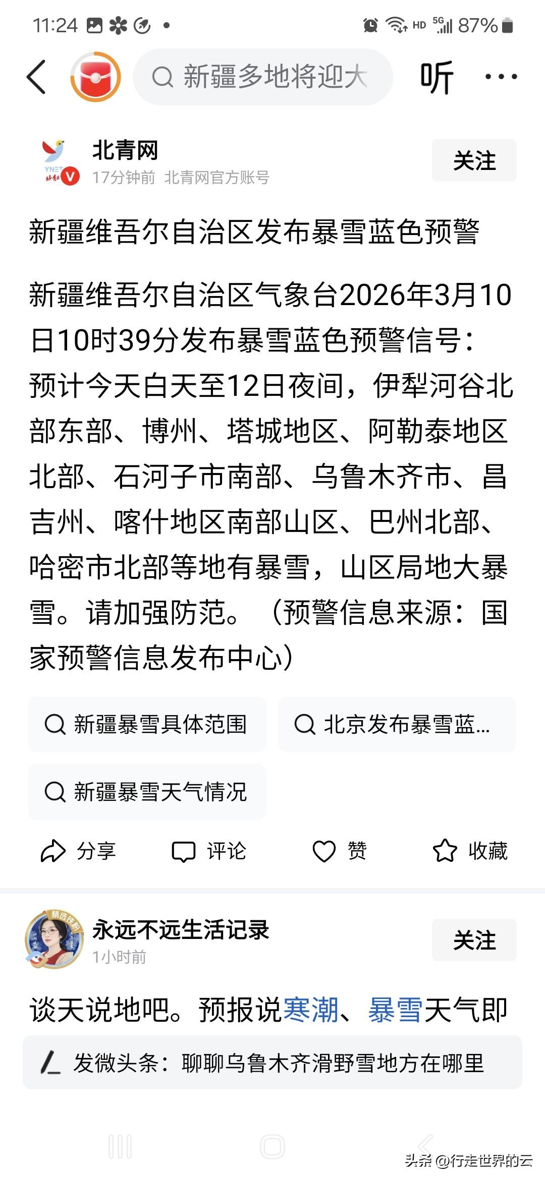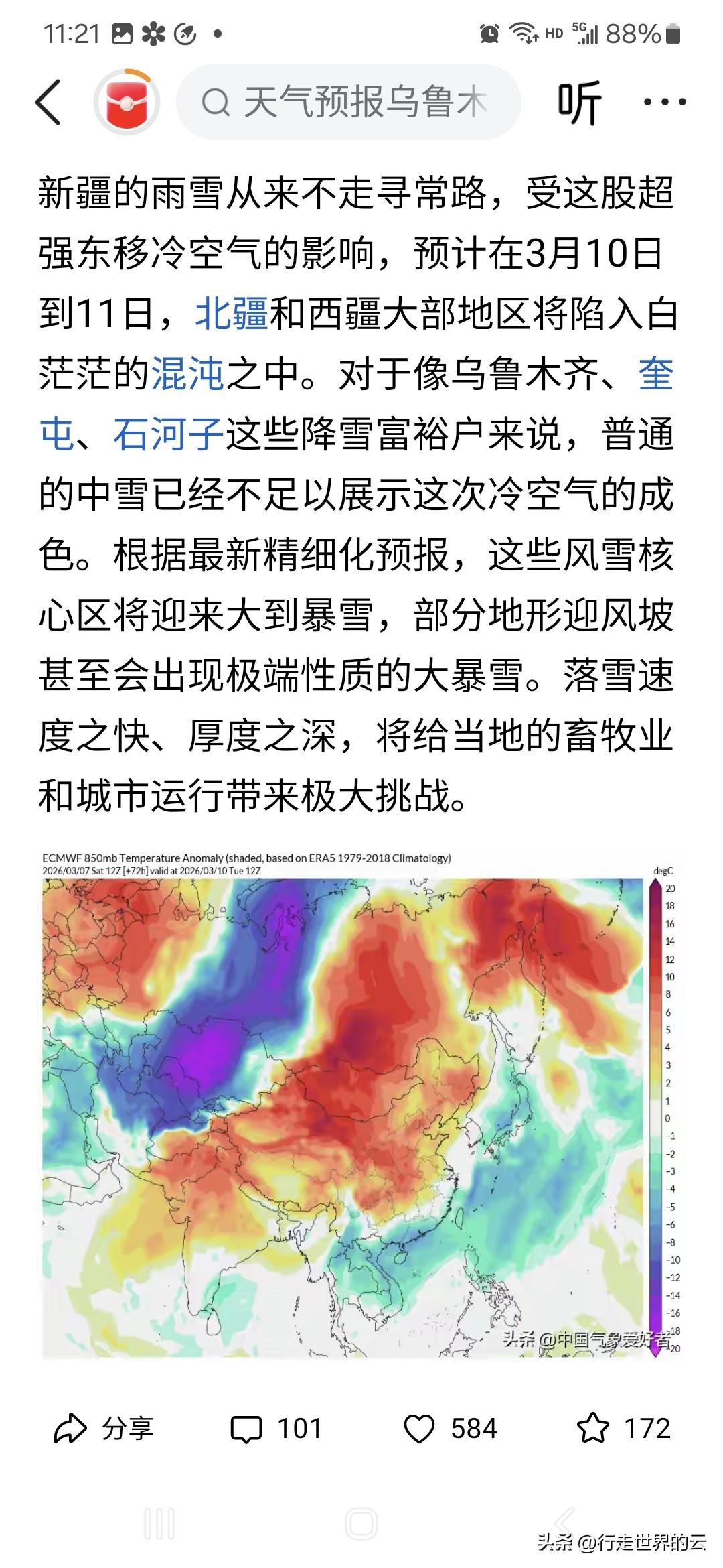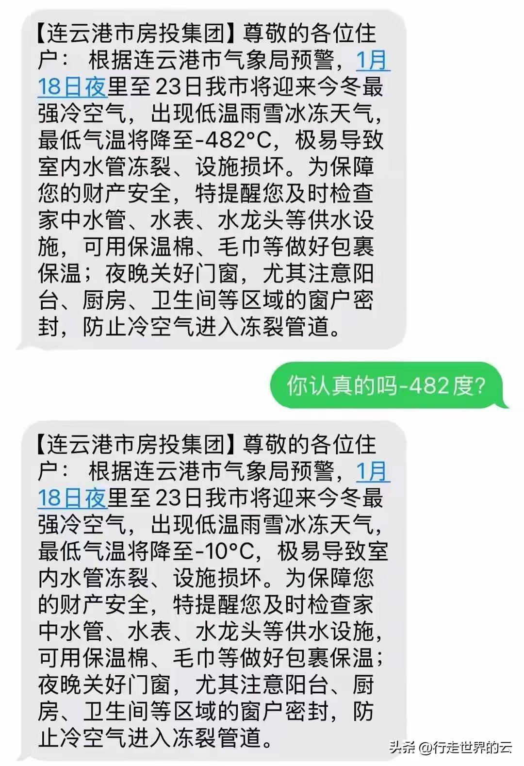 从前天开始,就不断说明天(3月11日)新疆多地含乌鲁木齐、塔城、阿勒泰等地暴雪,想起孔二愣子那句“过瘾呐”。让我们拭目以待。 几年前我们老家的省级气象部门官微上搞了个糗事,应该是“最低气温降至—6——12℃”即,“零下6到零下12℃”,中间是两根小横杠的,结果最后的审校人员删掉了,于是就成了“最低气温降至—612℃”。要知道目前最低温度叫绝对零度,即零下273.15℃,而且这还是一个理论上极限值。 无独有偶,春节前连云港某房投集团给客户发温馨提醒说气温会降至零下482℃。