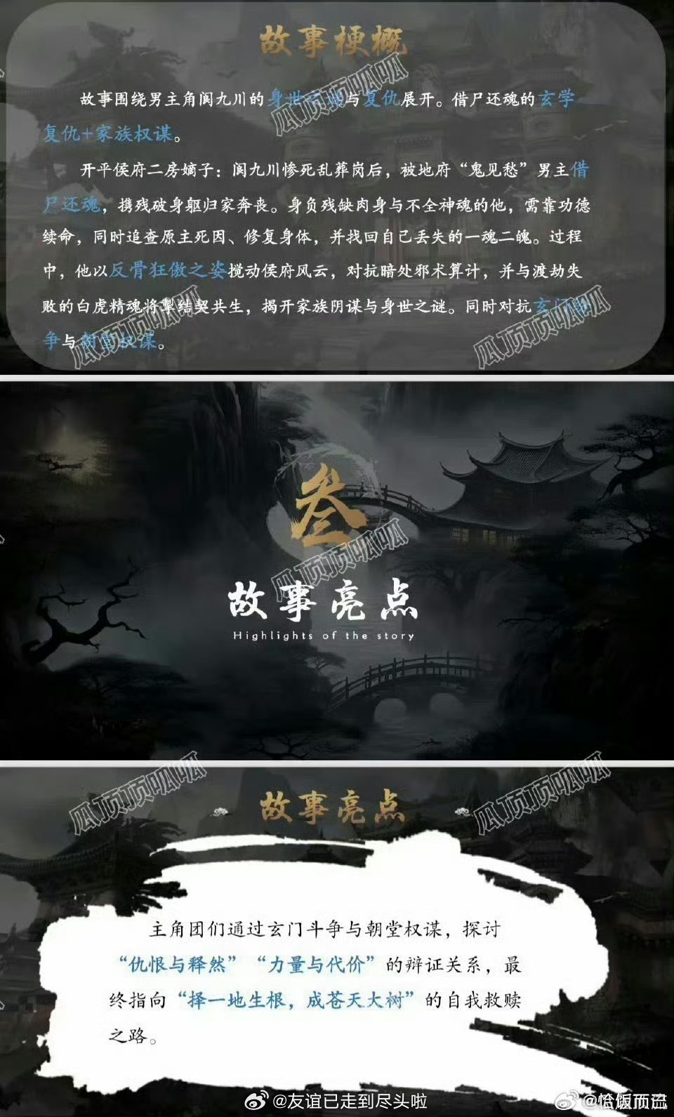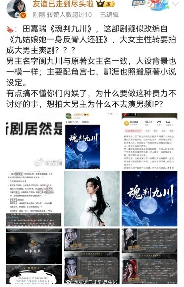 田嘉瑞新剧《魂判九川》开机原著是大女主小说《九姑娘她一身反骨人还狂》,影视化性转大男主。只性转女主,且男配照搬原著,不改人设。田嘉瑞连二番男主实绩都没有,就开始单独官宣扛剧大男主了,是《月鳞绮纪》给制片方的勇气吗? 魂判九川 电视剧魂判九川开机