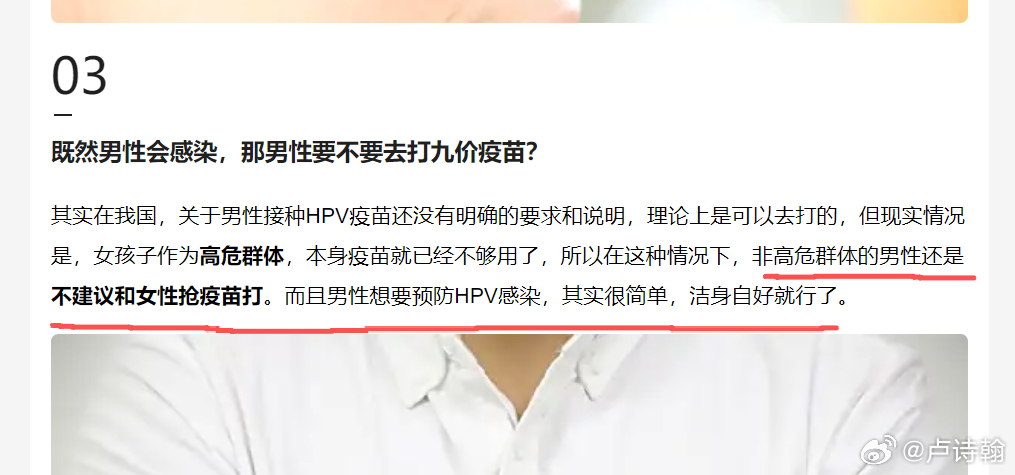 但可能是技术原因,也可能是传播歧义,亦或者这个逻辑和新一代许多人的认知违背了在许多人嘴里,中国社会是一个爱男的社会,女性是被压迫的,怎么可能出现优待女性的情况呢?所以绝对不可能是男性让的那怎么办呢?只可能是男性不需要HPV疫苗