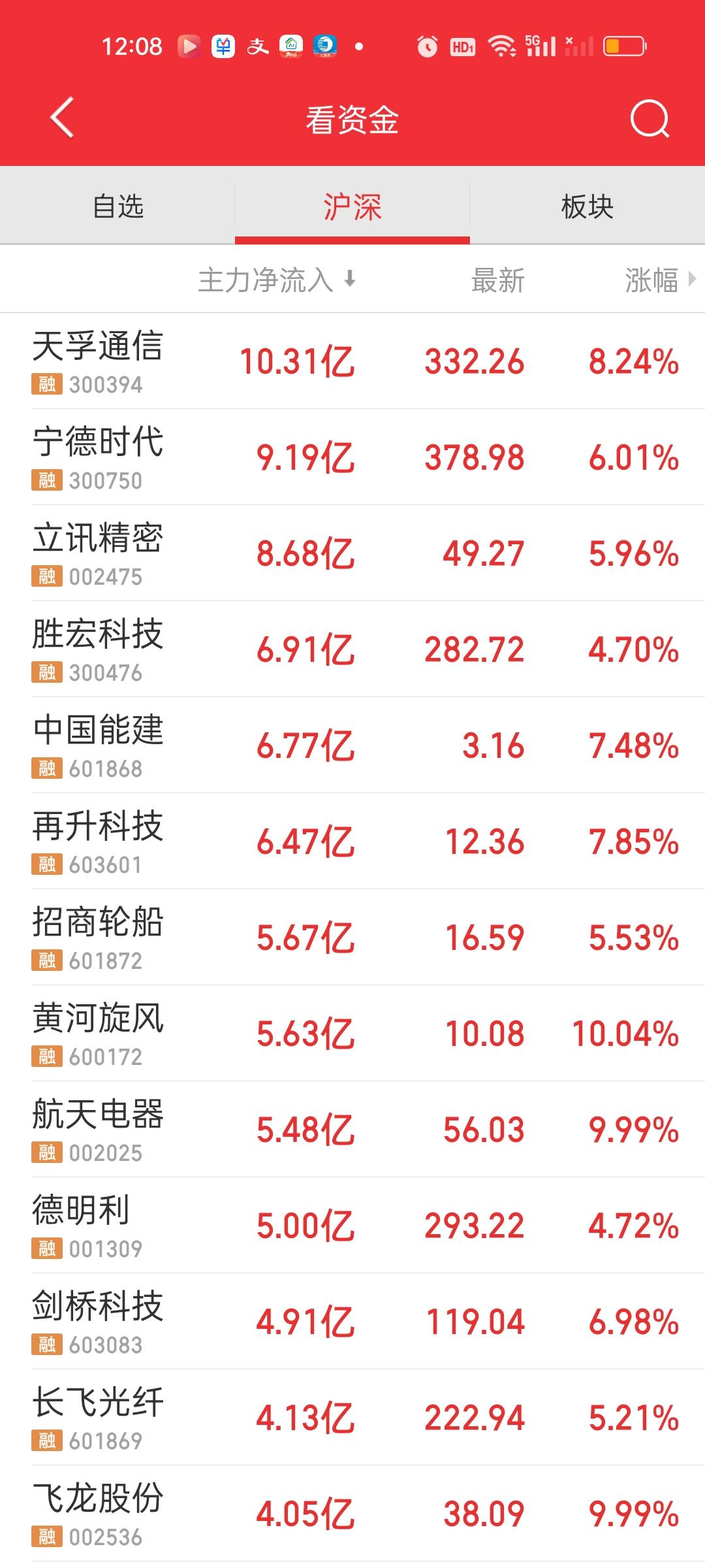 中午收盘了,今天有超过4300家个股上涨,54家涨停,赚钱效应应该是这几天最好的。但成交量缩了1935亿,大盘资金净流出32.70亿。开盘半小时后,大盘还是有明显的资金外逃现象,大盘资金也从净流入转为净流出。现在这种情况要想放量只能下杀。否则下午还要继续缩量。 昨天跌的最厉害的CPO,今天涨幅反而居前,昨天最多的时候跌了7%,尾盘跌2%,今天直接涨了3个多点。如果昨天在最低点介入,已经吃到快10个点了。 主力资金净流入方面,只有天孚一家净流入在10亿以上,净流出方面,也只有拓维一家净流出资金在10亿以上。