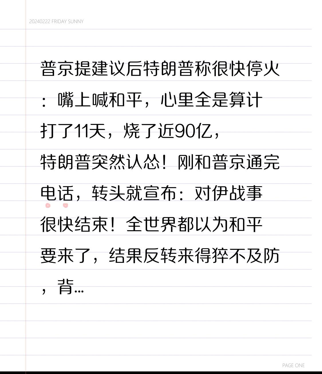 普京提建议后特朗普称很快停火:嘴上喊和平,心里全是算计 打了11天,烧了近90亿,特朗普突然认怂!刚和普京通完电话,转头就宣布:对伊战事很快结束!全世界都以为和平要来了,结果反转来得猝不及防,背后真相太现实! 美以空袭伊朗进入白热化,导弹炸平城市、学校成废墟,上百名无辜孩童丧命,平民流离失所。就在局势濒临失控时,特朗普主动拨通普京电话,这通长达一小时的通话,成了战争的转折点。 普京当场提出政治外交解决方案,呼吁尽快停火。挂完电话,特朗普态度180度大转弯,从“要打垮伊朗”变成“战事很快结束”,还取消部分石油制裁安抚市场。 本以为是普京劝动了特朗普,转折点来了:这根本不是良心发现,而是被现实逼到绝境! 首先,美军打不动了!伊朗反击远超预期,高超音速导弹频频突破防线,美军基地接连遇袭,10天耗资89亿,国库扛不住,国内反战浪潮汹涌,特朗普大选压力山大,再打下去只会深陷泥潭。 其次,特朗普要找台阶下!嘴上说“很快停火”,却补刀“本周不停”,还疯狂秀战绩,宣称伊朗“没海军、没空军、没通讯”,实则是想体面收场,既保住霸主面子,又避免全面战争。 更讽刺的是,他还死死拿捏以色列,直言“以色列不能单独打”,把停战主导权攥在手里,本质是不想被以色列拖入持久战。 而伊朗的回应,直接戳破谎言!伊朗副外长强硬表态:停火可以,必须保证不再侵略;军方更是放狠话:战争何时停,不由美以定,由伊朗说了算!导弹反击一刻没停,摆明了奉陪到底。 这场看似突然的停火信号,不过是大国博弈的算计:特朗普想止损,普京想促和,伊朗想尊严,以色列想继续打,四方各怀鬼胎,和平遥遥无期。 最让人心疼的,永远是战火中的平民。他们没做错任何事,却成了霸权博弈的牺牲品,失去家园、失去亲人,在废墟里绝望哭泣。 特朗普的一句“很快停火”,改变不了满目疮痍;普京的调解建议,挡不住导弹呼啸。战争从来没有赢家,只有受苦的百姓。 我们庆幸生在和平的中国,不用体会流离失所的恐惧。真心祈愿:战火早日熄灭,无辜者不再受伤,世界再无霸权,只有平等与安宁。 你觉得特朗普是真停战,还是缓兵之计?评论区说说你的看法!