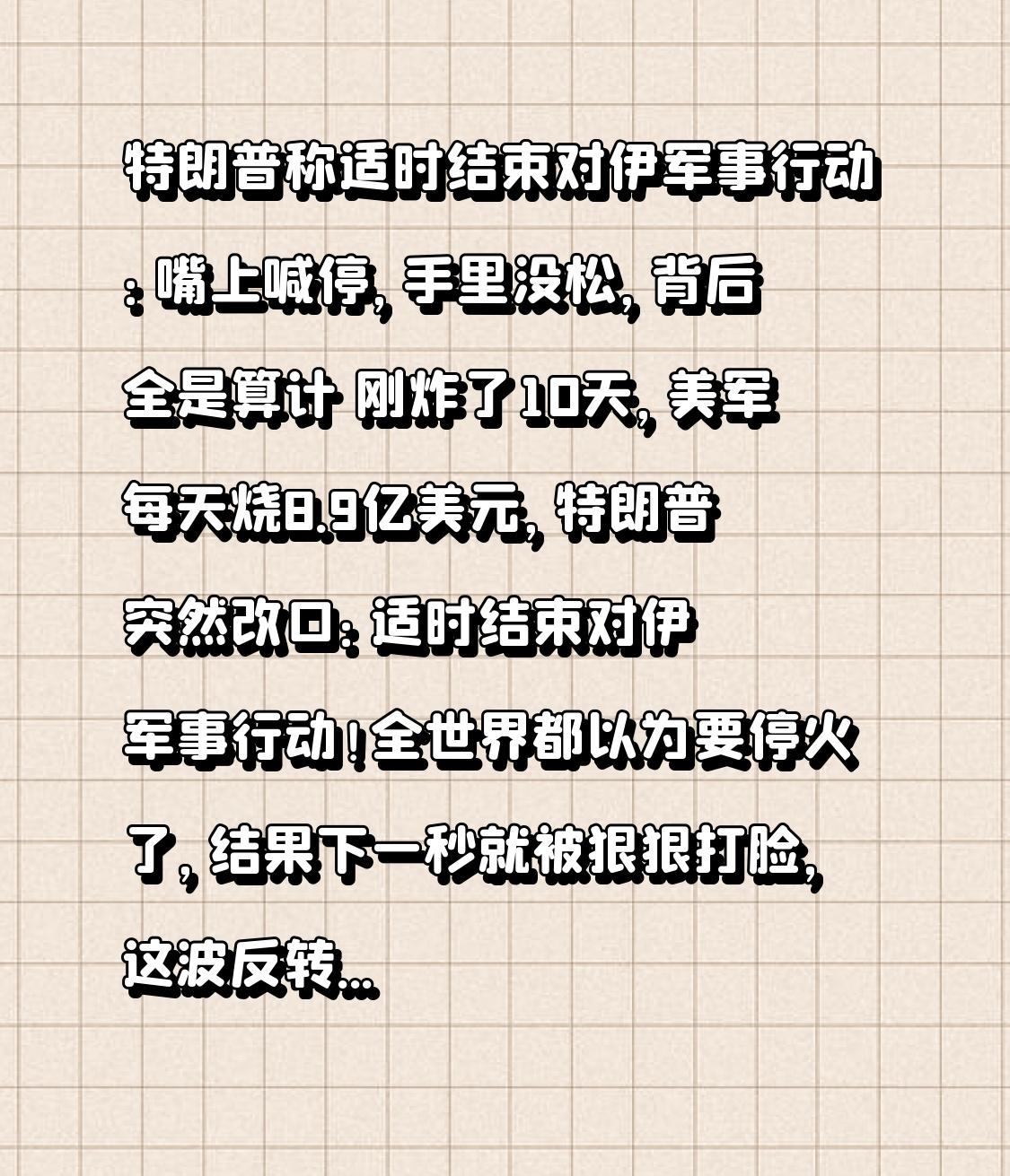 特朗普称适时结束对伊军事行动:嘴上喊停,手里没松,背后全是算计 刚炸了10天,美军每天烧8.9亿美元,特朗普突然改口:适时结束对伊军事行动!全世界都以为要停火了,结果下一秒就被狠狠打脸,这波反转,比电视剧还刺激! 美以空袭伊朗进入第十天,德黑兰、伊斯法罕被炸成一片火海,导弹呼啸、楼房坍塌,无数平民流离失所,连小学都没能幸免,上百名孩子永远留在了废墟里。就在所有人以为战争要升级时,特朗普突然放话:对伊行动是“短期行动”,很快就会结束,但又补了一句:本周不会停。 这话一出,全网懵了:到底打不打?停不停? 转折点来了,真相远比想象更残酷! 特朗普嘴上喊着结束,转头就列出“辉煌战绩”:摧毁伊朗5000多个目标,击沉51艘军舰,废掉90%导弹发射器,甚至放狠话:伊朗已经没海军、没空军、没通讯,只剩“空壳”。更狠的是,他还留了后手,威胁要打击伊朗电力、民生设施,一旦伊朗封锁海峡,就发动20倍力度打击。 一边说停战,一边秀肌肉、放狠话,这哪是结束,分明是换个方式施压! 背后原因更现实:美军打不动了!短短10天耗资超89亿美元,导弹、战机轮番上阵,国库扛不住,国内反对声越来越大。而伊朗非但没垮,反而越打越勇,600次导弹打击、2600次无人机反击,200多处美以目标被摧毁,摆明了要打持久战。 特朗普急了,所谓“适时结束”,不过是打累了想歇口气,既想保住面子,又想逼伊朗妥协,典型的“胡萝卜加大棒”。 最让人心疼的,永远是无辜平民。学校被炸、家园被毁、亲人离世,孩子们的课本染满鲜血,老人在废墟里痛哭,他们没做错任何事,却成了大国博弈的牺牲品。 特朗普的一句“适时结束”,改变不了战火纷飞的现实;所谓的战绩,掩盖不了平民的血泪。战争从来没有赢家,只有两败俱伤,只有受苦的百姓。 我们庆幸生在和平的中国,不用体会流离失所的恐惧。也真心祈愿:战火早日熄灭,无辜者不再受伤,每个生命都能被温柔以待。 你觉得特朗普是真停战,还是缓兵之计?评论区说说你的看法!