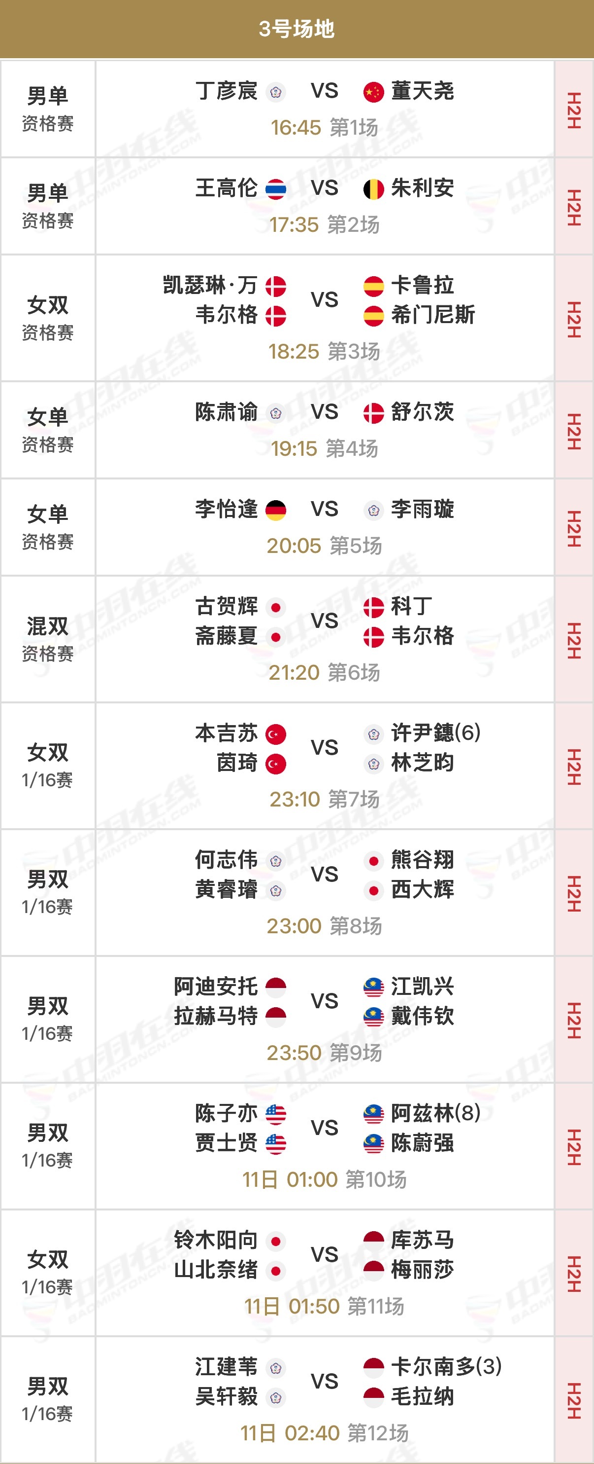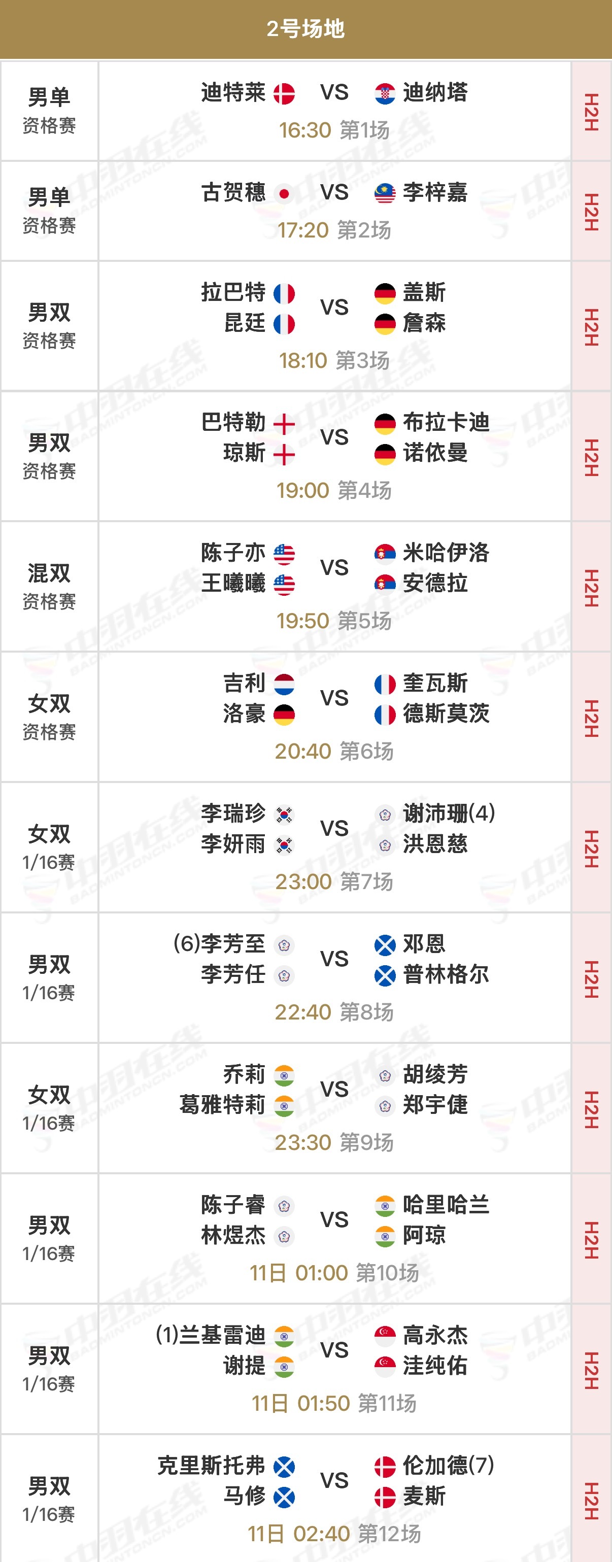 【一号场地】②🇨🇳朱轩辰vs金廷🇮🇩(资格赛)④🇨🇳朱一珺/李茜vs渡边勇大/田口真彩🇯🇵(资格赛)⑨🇨🇳鲍骊婧/罗徐敏vs阿莱西娅/费比🇮🇩
