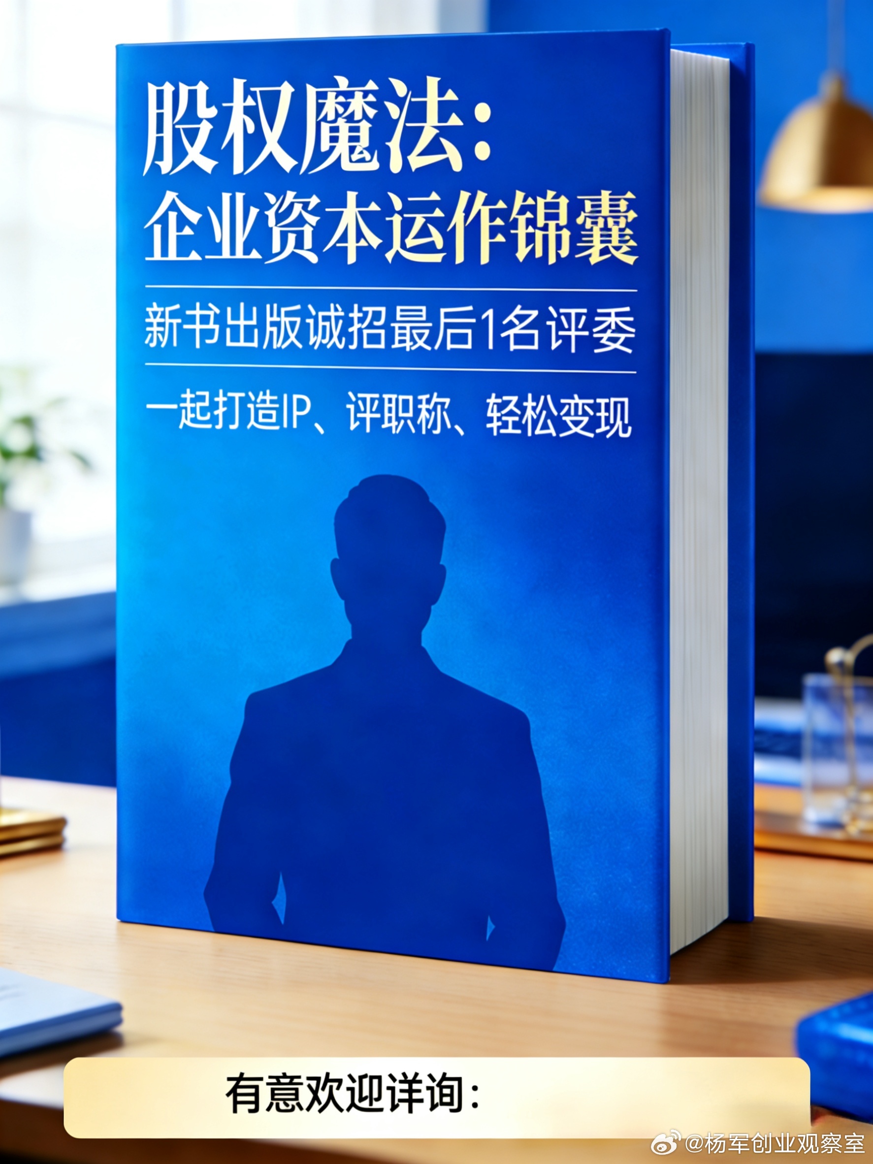 新书《股权魔法:企业资本运作锦囊》将于几月内出版,现仅缺最后一名编委,欢迎你也加入,快速打造IP、评职称、主动变现更轻松!有意详询。股权魔法:企业资本运作锦囊