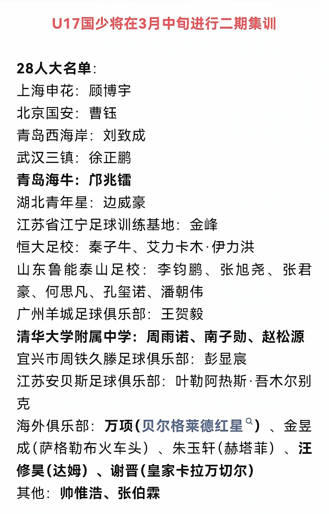 五名留洋球员回归,中国U17国少3月集训名单出炉,浮嶋敏为备战5月U17亚洲杯,招回了5名留洋球员,分别是:万项(贝尔格莱德红星)、金昱成(萨格勒布火车头)、朱玉轩(赫塔菲)、汪修昊(达姆)和谢晋(皇家卡拉万切尔),遗憾的是卢琪政和张洪福依然没能回归。 中国U17国少本次集训大名单一共28人,刚刚在青岛海牛上演中超首秀的邝兆镭领衔,帅惟浩和张伯霖2人2026上半年无职业比赛可踢,他俩只能踢国少热身赛保持状态了。 中国U17国少集训时间是3月13日至4月1日,集训地点在广东肇庆,集训期间将安排4场热身赛,对手为亚洲八强级别球队,目前热身赛对手还未公布,让我们拭目以待吧! 这次中国U17大名单实力比上次有提升,期待浮嶋敏磨合出最强阵容,为5月份的U17亚洲杯正赛做最后冲刺,期待这支“史上最强”中国U17能进世少赛,中国U17国少加油!