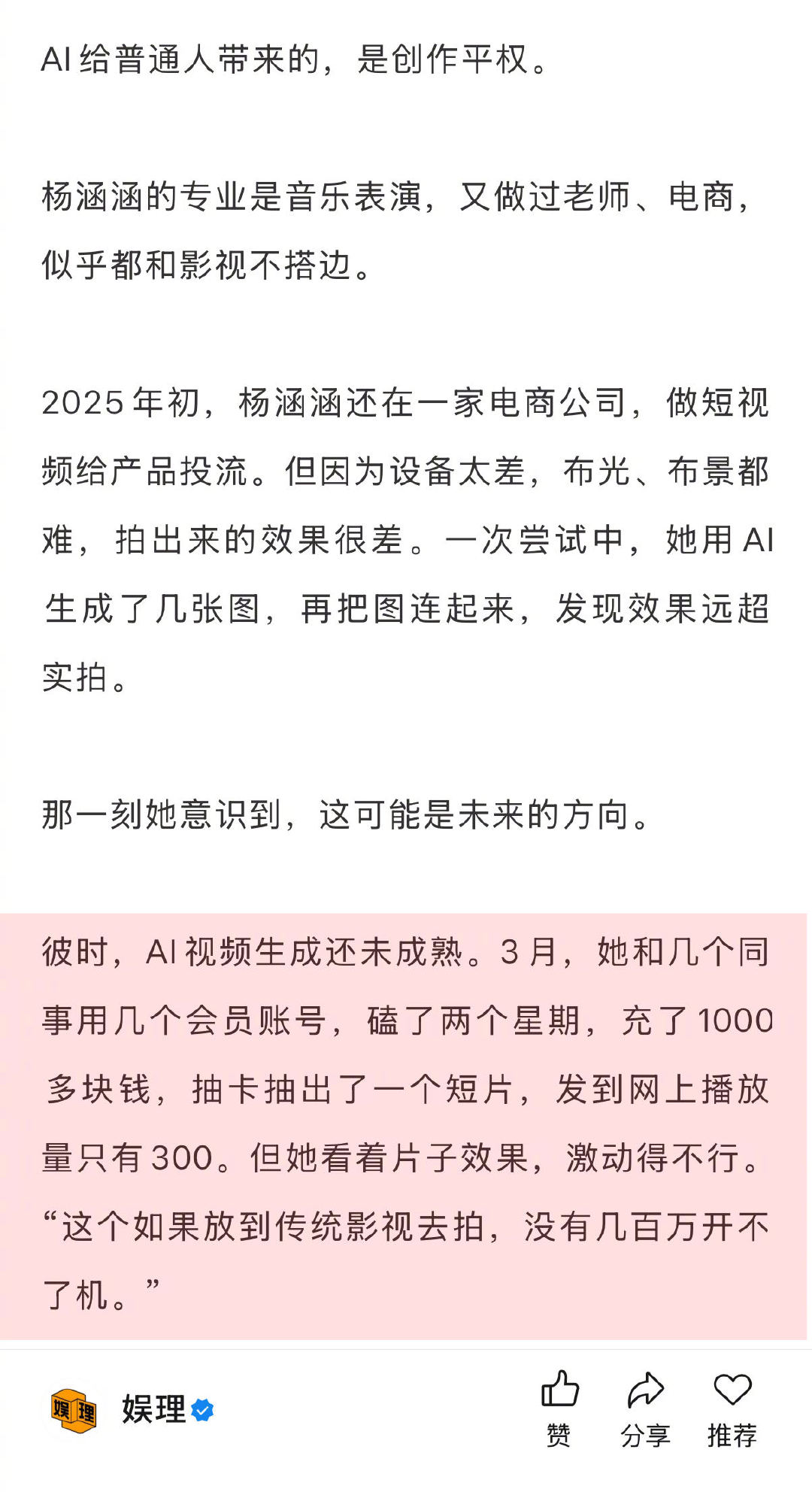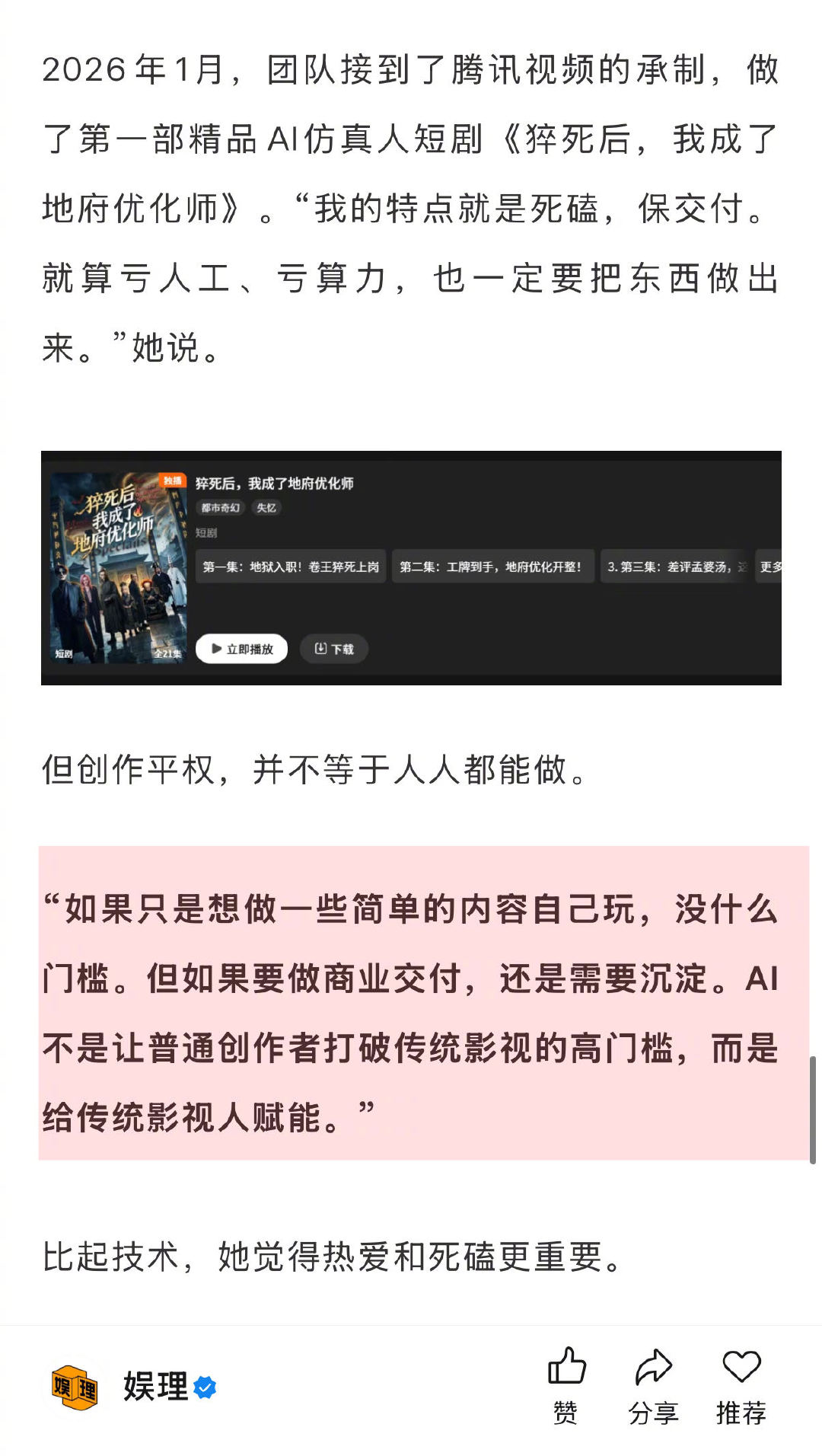 AI短剧霍去病导演否认营销炒作 AI短剧真的有暴富神话吗 2025年初,杨涵涵还在一家电商公司,一次和AI视频相关的尝试后,她意识到,这可能是未来的方向。“如果放到传统影视去拍,没有几百万开不了机。”但创作平权,并不等于人人都能做。“如果要做商业交付,还是需要沉淀。AI不是让普通创作者打破传统影视的高门槛,而是给传统影视人赋能…”娱理独家↓