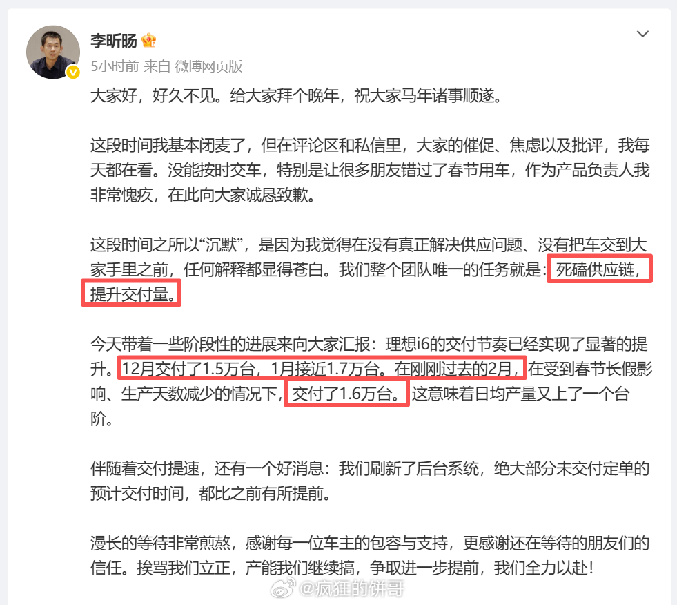 理想汽车产品线负责人李昕旸致歉交付慢的问题,表示要死磕供应链,提升交付量。大v聊车