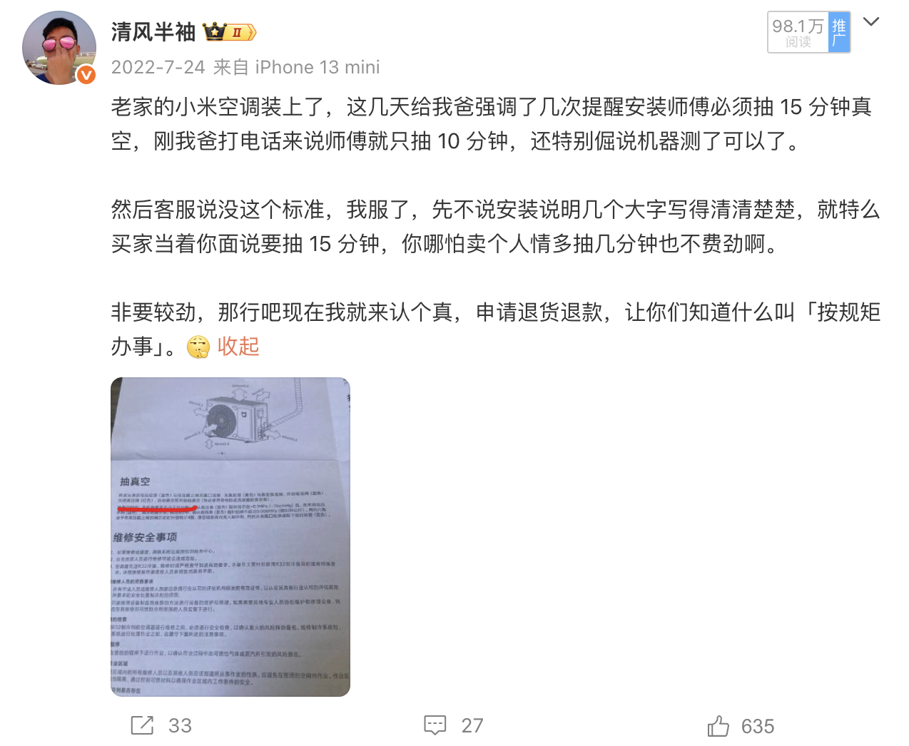 米家空调数字抽真空服务 装空调抽真空这点我可是斗争经验丰富,所以小米这个服务值得点赞,是应该的。