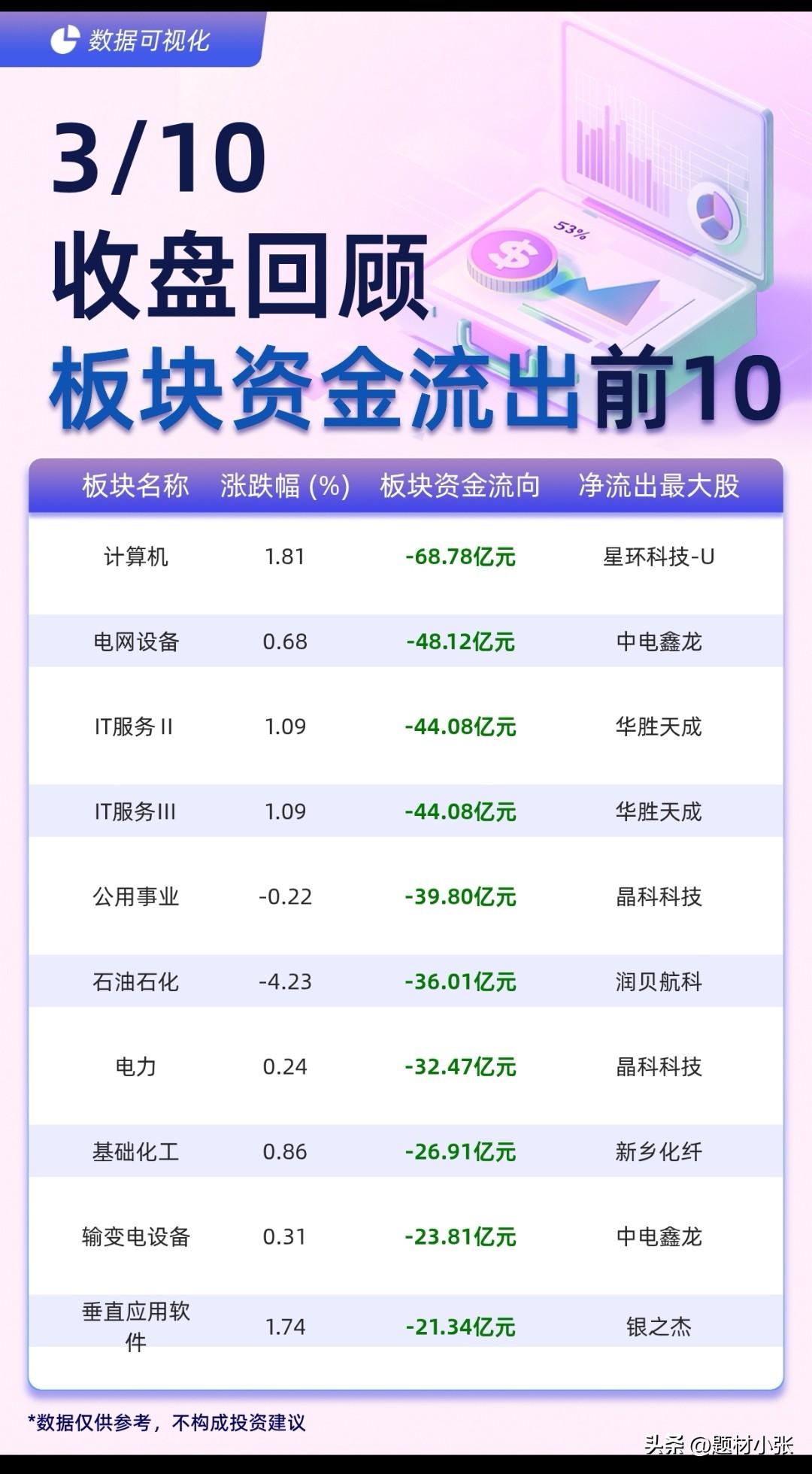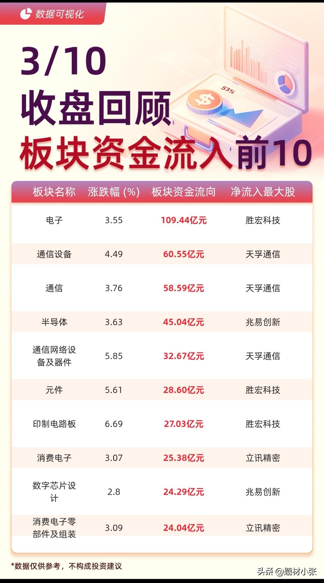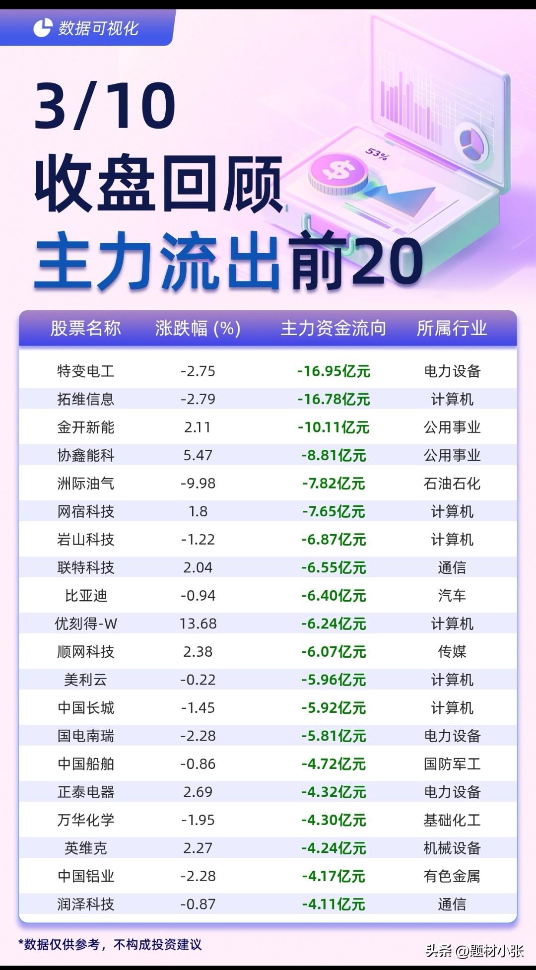 3月10日A股收盘,资金流向分化明显 主力流入端:通信、电子板块成吸金主力,天孚通信、胜宏科技分别获超12亿主力资金追捧,立讯精密、光迅科技等也跻身前列,国防军工、建筑装饰板块亦有个股获重点布局。 主力流出端:电力设备、计算机板块承压,特变电工、拓维信息遭超16亿主力资金净流出,公用事业、石油石化等板块部分个股同样面临资金撤离。 板块方面,电子板块以超百亿净流入领跑,通信设备、半导体等科技细分领域同步获资金青睐;而计算机、电网设备板块则成资金出逃重灾区,市场风格向高景气科技赛道倾斜明显。