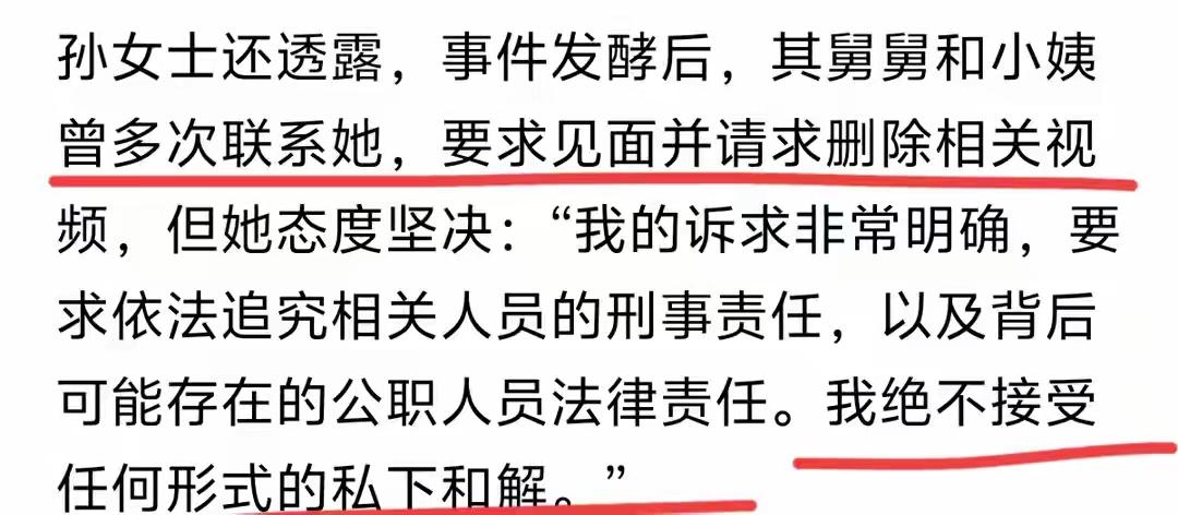 想私了?门都没有!河南鲁山舅舅对外甥女孙艺菲提出要求:见面协商,要求她删除所有视频。孙艺菲说永远不可能私底下协商了。他们早干嘛去了?在2008年孙艺菲妈妈生病的时候,舅舅和小姨是如何对待自己的亲姐姐的?孙艺菲9岁失去妈妈,10年期间,小姨都不让她见爸爸。爸爸在孙艺菲妈妈去世当月就来接女儿,却被其舅舅阻止。紧接着就是小姨卖了她妈妈的房产,舅舅和她妈妈假结婚,继承了遗产。现在已经上升成案件了,已经提级办理。想私了不可能。