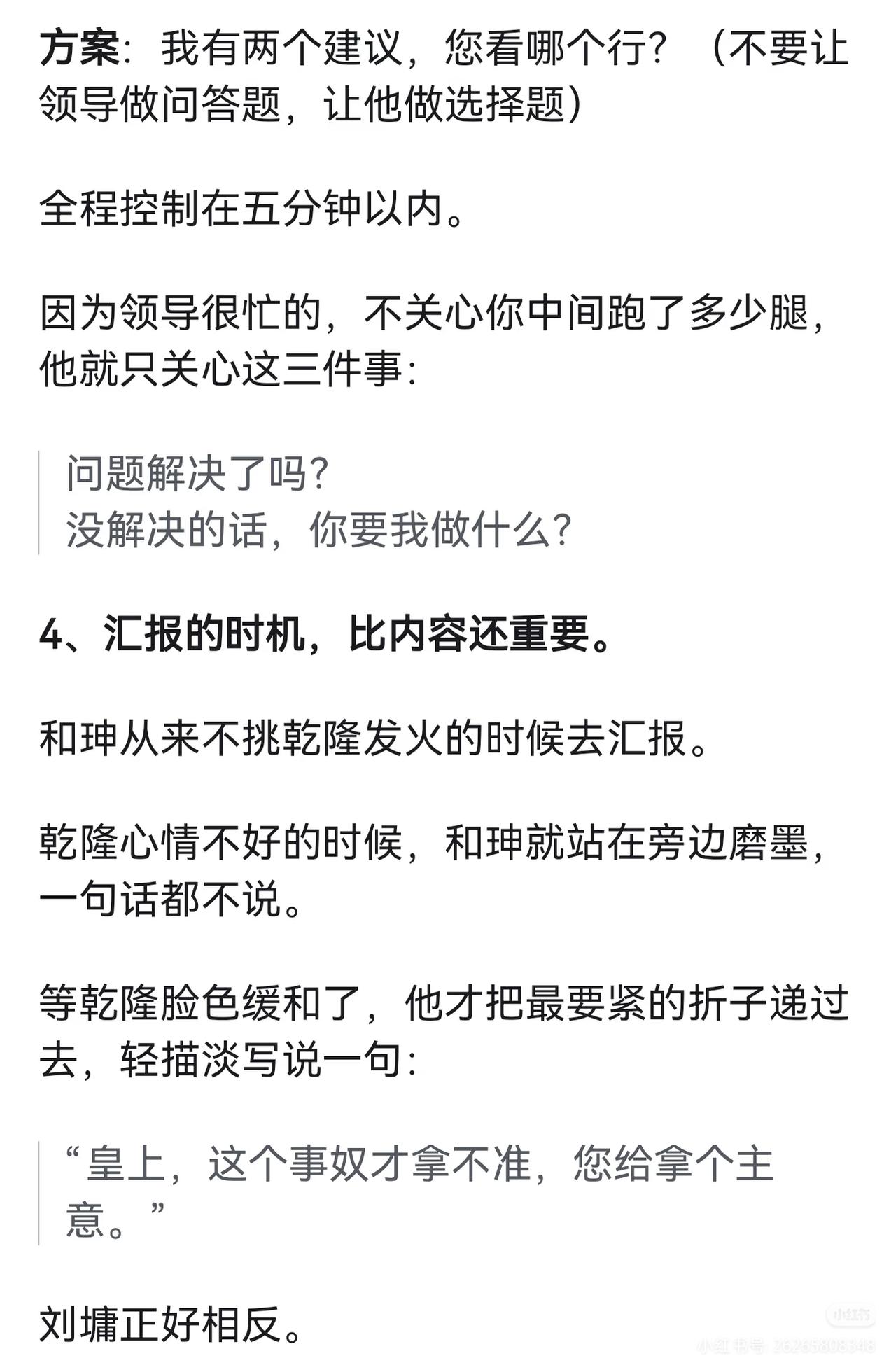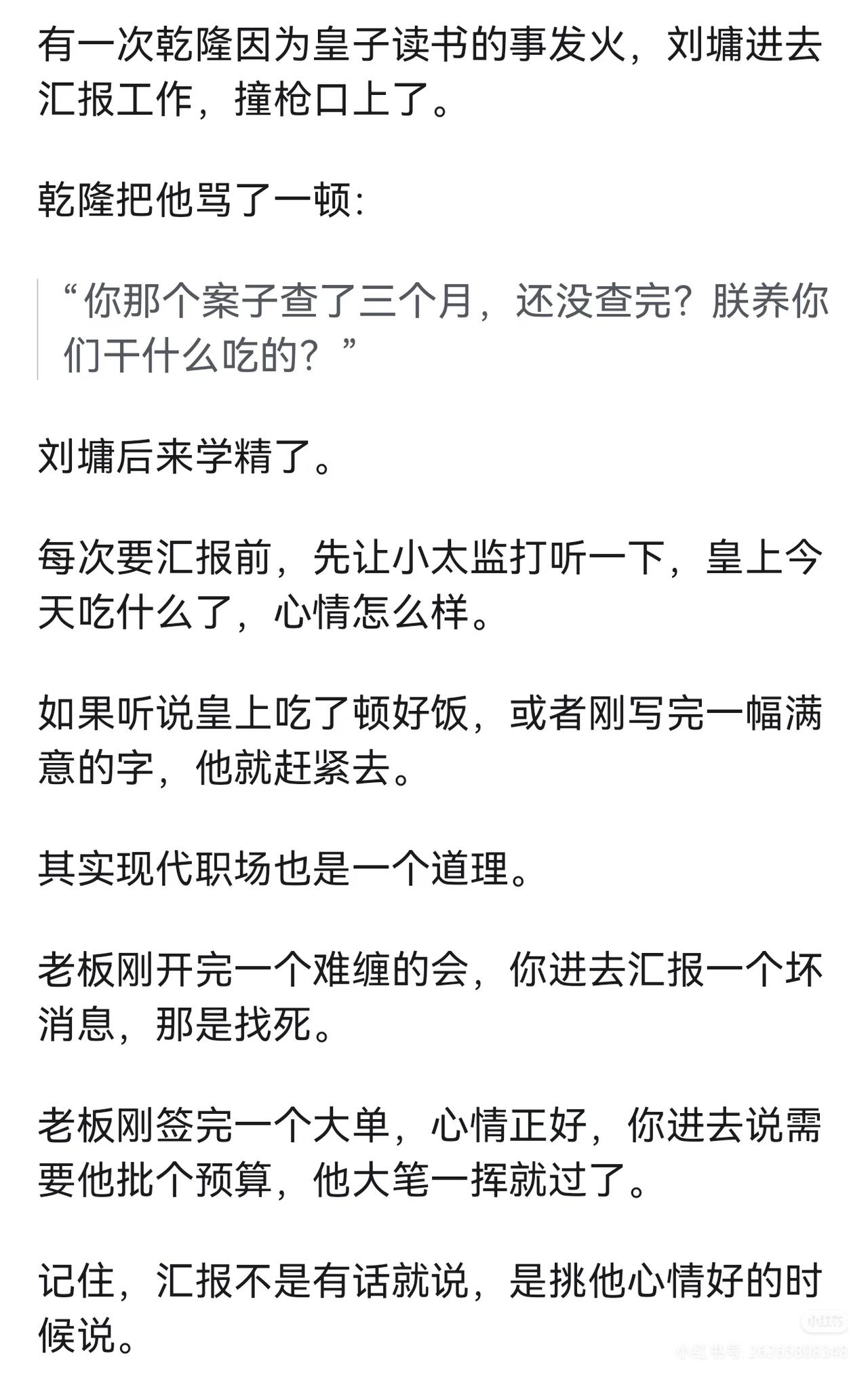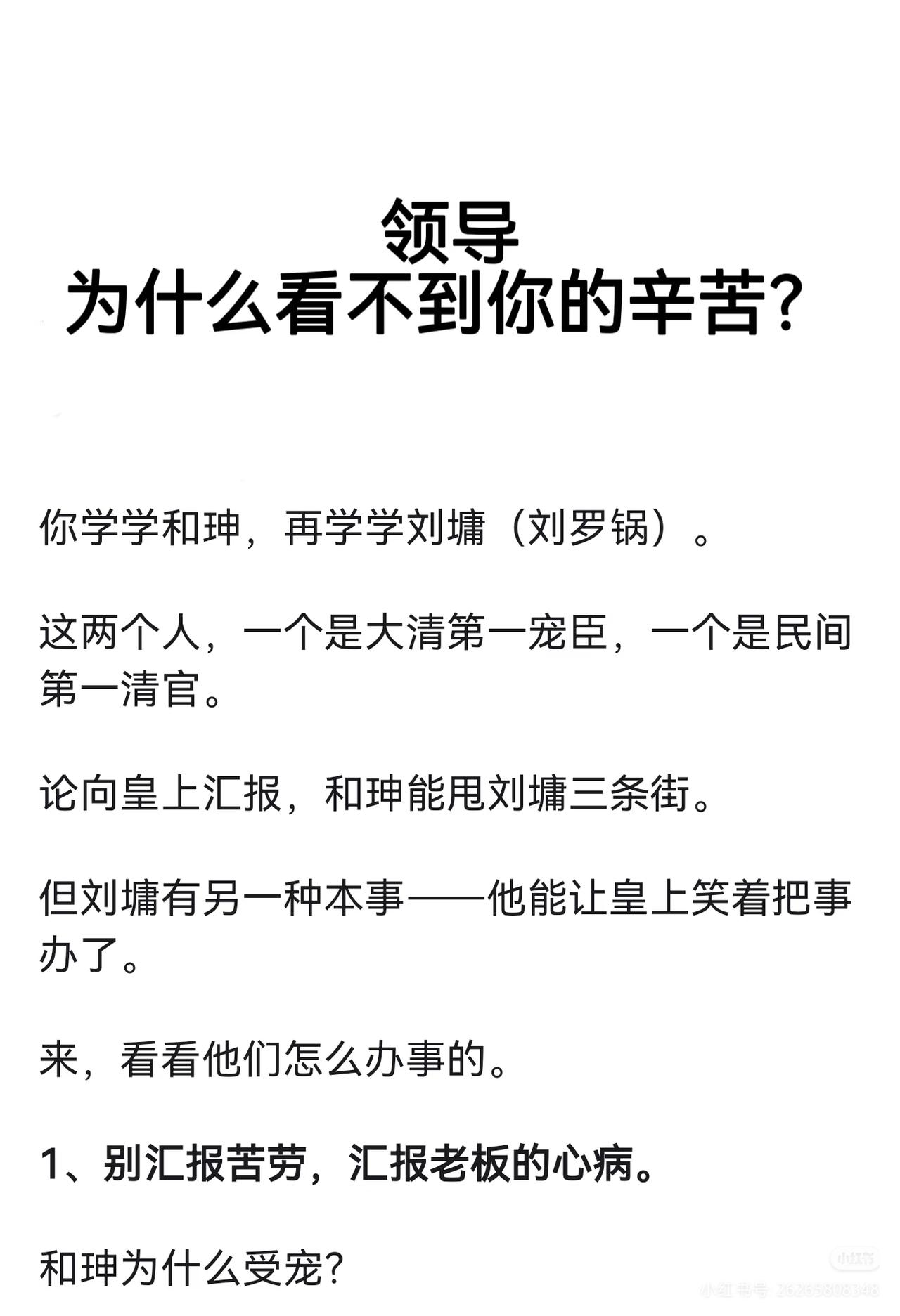 领导为什么看不到你的辛苦? 你学学和珅,再学学刘墉(刘罗锅)。 这两个人,一个是大清第一宠臣,一个是民间第一清官。 论向皇上汇报,和珅能甩刘墉三条街。 但刘墉有另一种本事﹣﹣他能让皇上笑着把事办了。 来,看看他们怎么办事的。 1、别汇报苦劳,汇报老板的心病。 和珅为什么受宠?不是因为会拍马屁,是因为他能干成乾隆想干但干不成的事。 乾隆四十五年,云南按察使海宁举报云贵总督李侍尧+贪腐。 乾隆派人去查,查了半年,什么都没查出来。 李侍尧是乾隆一手提拔的老臣,这案子再查下去,就是打乾隆自己的脸。 这时候和珅主动请缨。 他到了云南,第一件事不是翻账本,而是把李侍尧的管家抓起来,单独审。 管家全招了。 和珅拿着口供去见李侍尧: "您是老臣,皇上不想让您太难堪,您自己写个请罪折子,说一时糊涂,皇上会念旧情的。" 李侍尧写了。然后和珅回京,带回来的不是一堆烂账,而是一份"保全体面"的解决方案。 乾隆龙颜大悦: 朕就知道,这事只有和珅能办妥。 其实现代职场也一样道理。 领导每天操心的事就那么几件: 比如上边压下来的指标、平级踢过来的皮球、下边搞不定的烂摊…… 你汇报的时候,别只说"我干了多少多少活",而要说"我帮你把那个最头疼的事往前推了一步"。 领导一听是这个,肯定记住了。 2、汇报前,先问自己三个问题。 刘墉在这方面吃过亏。 有一次乾隆问刘墉: "你爹(刘统勋)以前当官的时候,家里穷成那样,他怎么还能硬气地参人呢?" 刘墉老老实实回答,臣不知。 乾隆没说话,但心里想的是: 你爹能参人,是因为他不要钱,你呢? 后来刘墉学乖了。 他发现乾隆每次找他聊天,其实都在铺垫某件事。 比如问"你爹怎么参人的",其实是暗示他想整顿吏治,让刘墉站出来当那个参人的刀。 刘墉后来汇报前,必问自己三个问题: 1、皇上最近老提啥事?(他关心什么)2、这事现在卡在谁手里?(难点在哪)