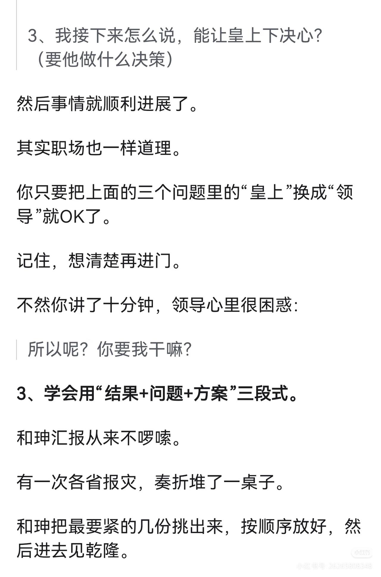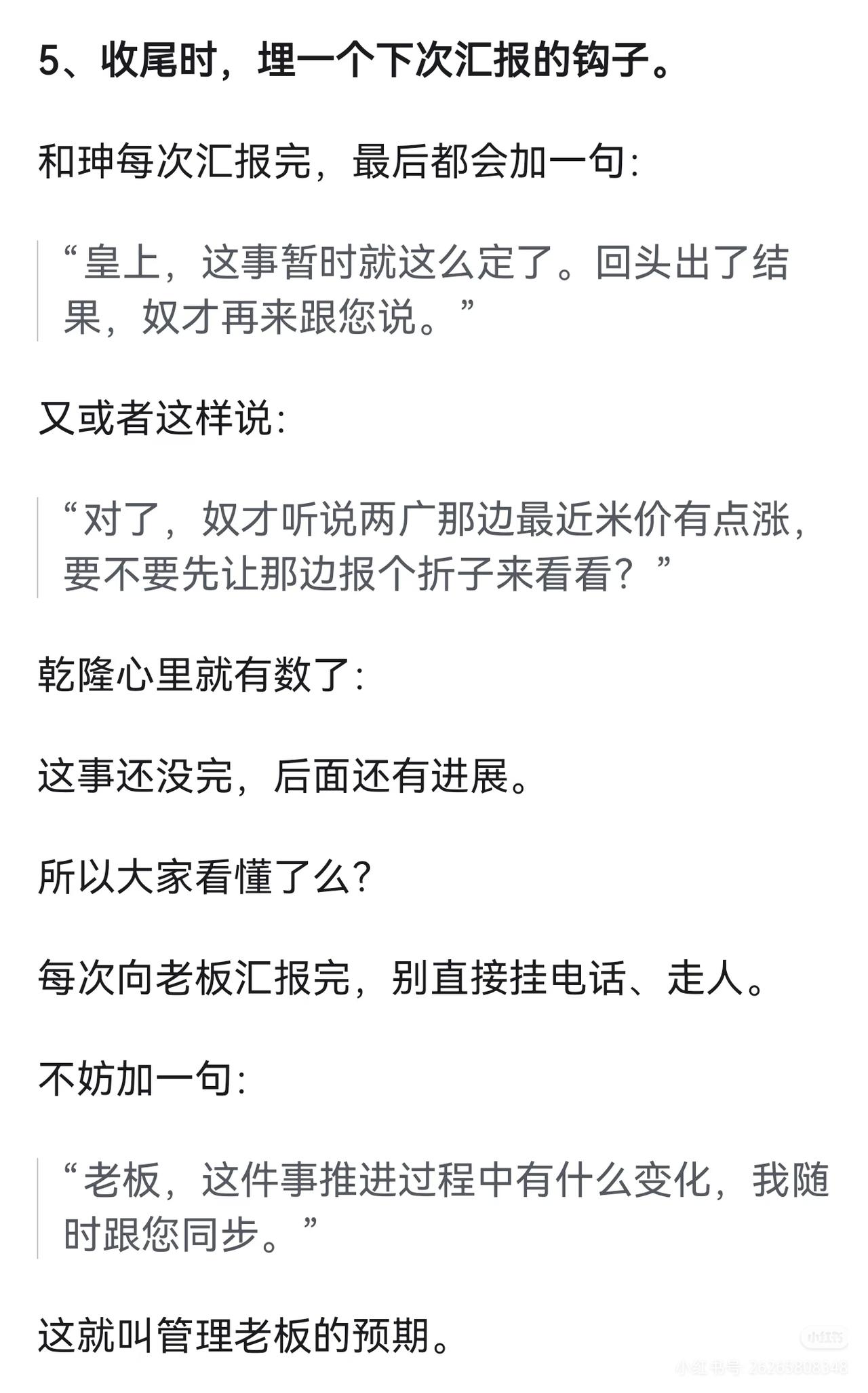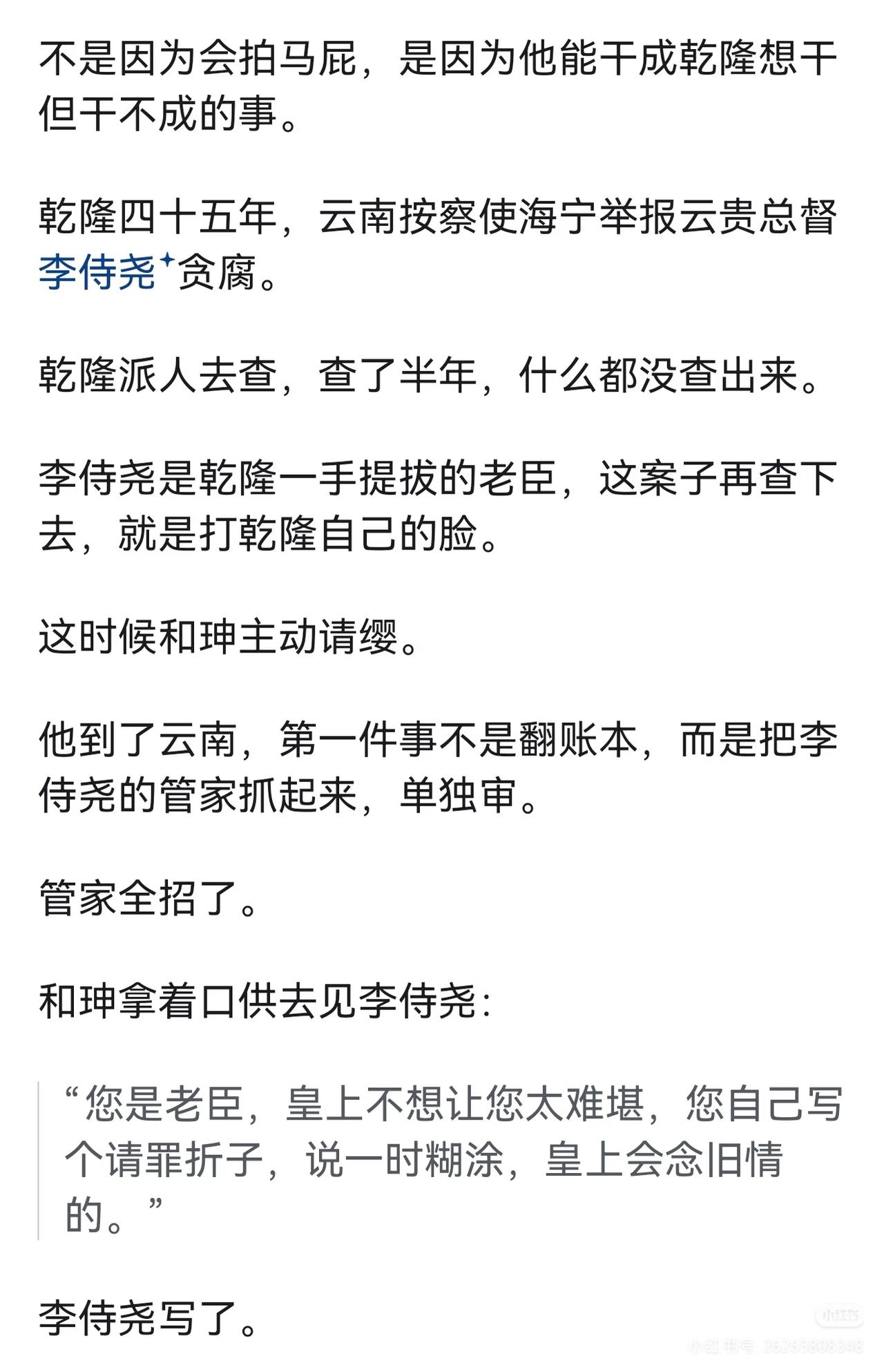 领导为什么看不到你的辛苦? 你学学和珅,再学学刘墉(刘罗锅)。 这两个人,一个是大清第一宠臣,一个是民间第一清官。 论向皇上汇报,和珅能甩刘墉三条街。 但刘墉有另一种本事﹣﹣他能让皇上笑着把事办了。 来,看看他们怎么办事的。 1、别汇报苦劳,汇报老板的心病。 和珅为什么受宠?不是因为会拍马屁,是因为他能干成乾隆想干但干不成的事。 乾隆四十五年,云南按察使海宁举报云贵总督李侍尧+贪腐。 乾隆派人去查,查了半年,什么都没查出来。 李侍尧是乾隆一手提拔的老臣,这案子再查下去,就是打乾隆自己的脸。 这时候和珅主动请缨。 他到了云南,第一件事不是翻账本,而是把李侍尧的管家抓起来,单独审。 管家全招了。 和珅拿着口供去见李侍尧: "您是老臣,皇上不想让您太难堪,您自己写个请罪折子,说一时糊涂,皇上会念旧情的。" 李侍尧写了。然后和珅回京,带回来的不是一堆烂账,而是一份"保全体面"的解决方案。 乾隆龙颜大悦: 朕就知道,这事只有和珅能办妥。 其实现代职场也一样道理。 领导每天操心的事就那么几件: 比如上边压下来的指标、平级踢过来的皮球、下边搞不定的烂摊…… 你汇报的时候,别只说"我干了多少多少活",而要说"我帮你把那个最头疼的事往前推了一步"。 领导一听是这个,肯定记住了。 2、汇报前,先问自己三个问题。 刘墉在这方面吃过亏。 有一次乾隆问刘墉: "你爹(刘统勋)以前当官的时候,家里穷成那样,他怎么还能硬气地参人呢?" 刘墉老老实实回答,臣不知。 乾隆没说话,但心里想的是: 你爹能参人,是因为他不要钱,你呢? 后来刘墉学乖了。 他发现乾隆每次找他聊天,其实都在铺垫某件事。 比如问"你爹怎么参人的",其实是暗示他想整顿吏治,让刘墉站出来当那个参人的刀。 刘墉后来汇报前,必问自己三个问题: 1、皇上最近老提啥事?(他关心什么)2、这事现在卡在谁手里?(难点在哪)