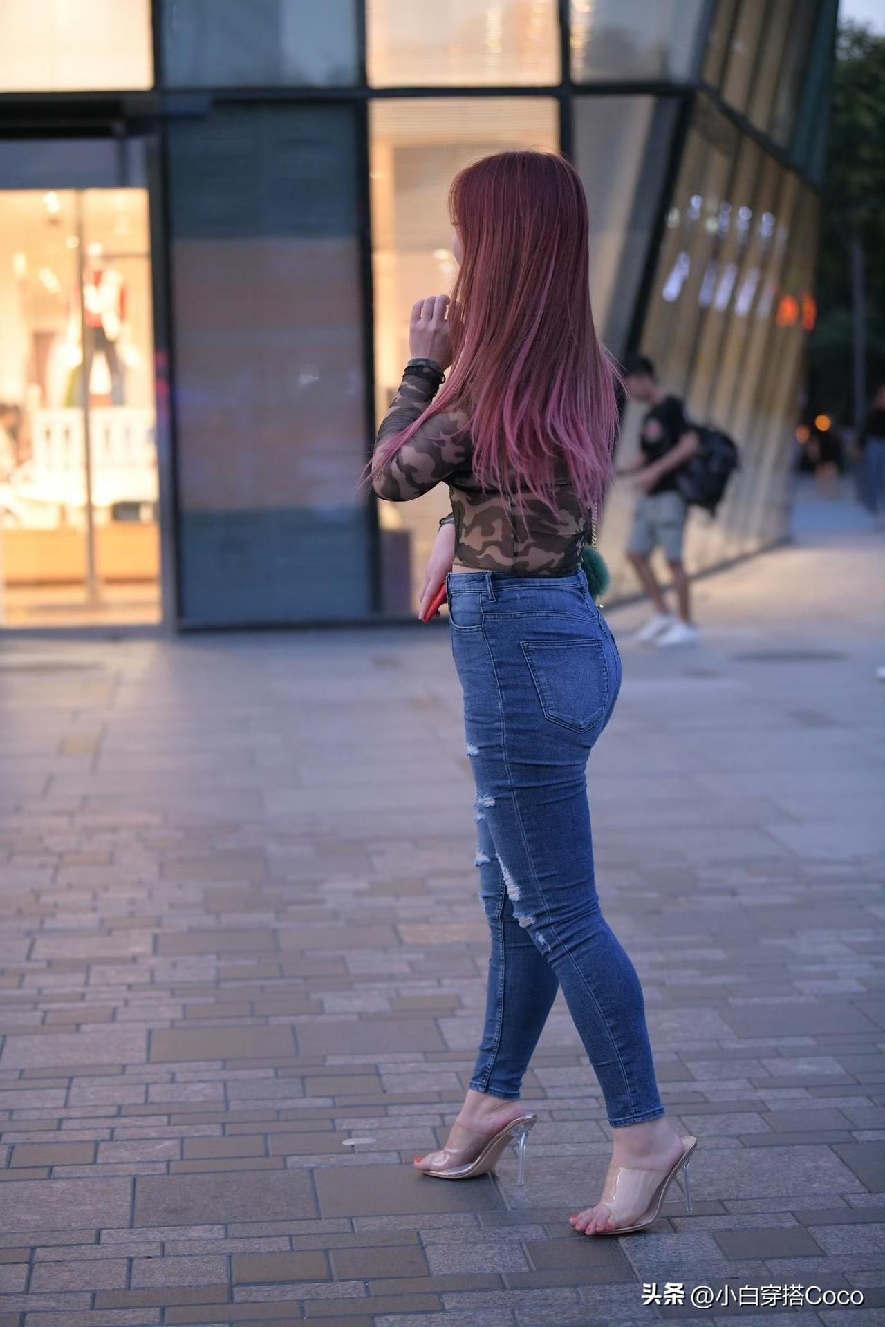 上衣:迷彩网纱长袖,微透面料自带朦胧滤镜,把纯欲氛围拉满, 下装:高腰破洞紧身牛仔裤,做旧磨白工艺自带复古感,破洞细节增加了随性感, 搭配一双裸色高跟凉鞋,延伸腿部线条的同时,中和了牛仔的硬朗,瞬间成为全身的吸睛亮点。