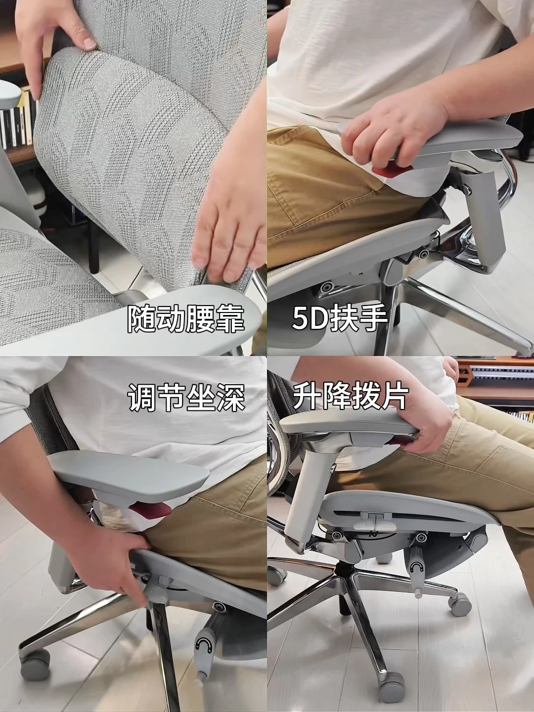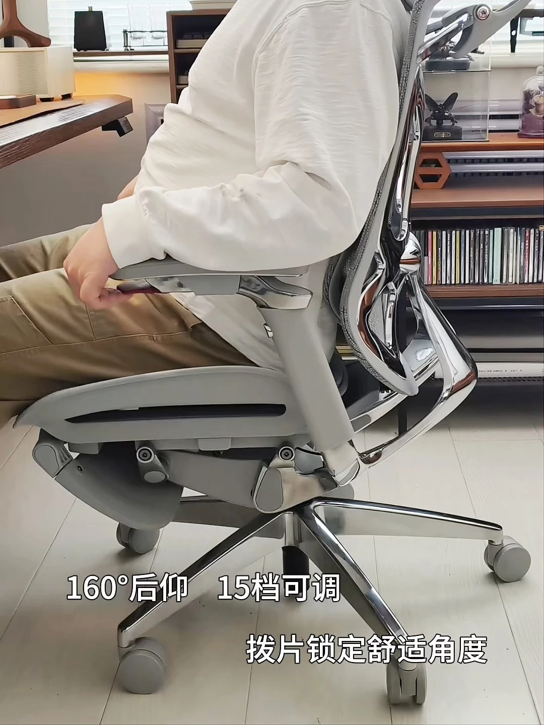 扶手下的隐藏拨片,不用弯腰的同时随手一捏就能调高度和后仰角度,15档锁定几乎接近无极调节,随心所欲懒人真的爱了😭 同步滑翔底盘安全感拉满。
