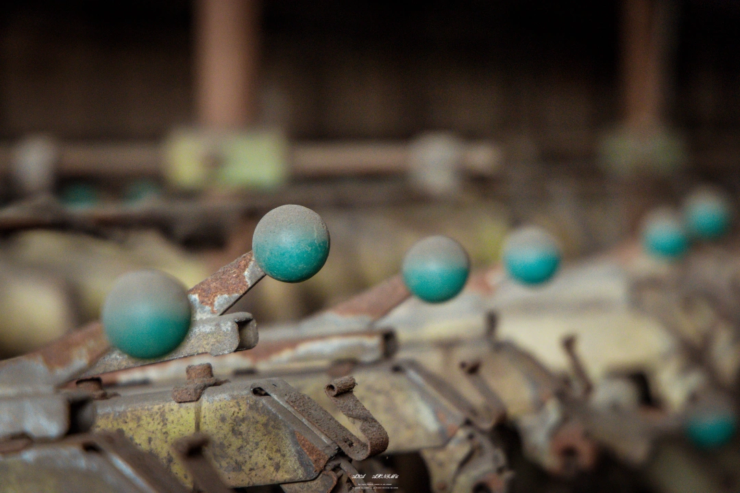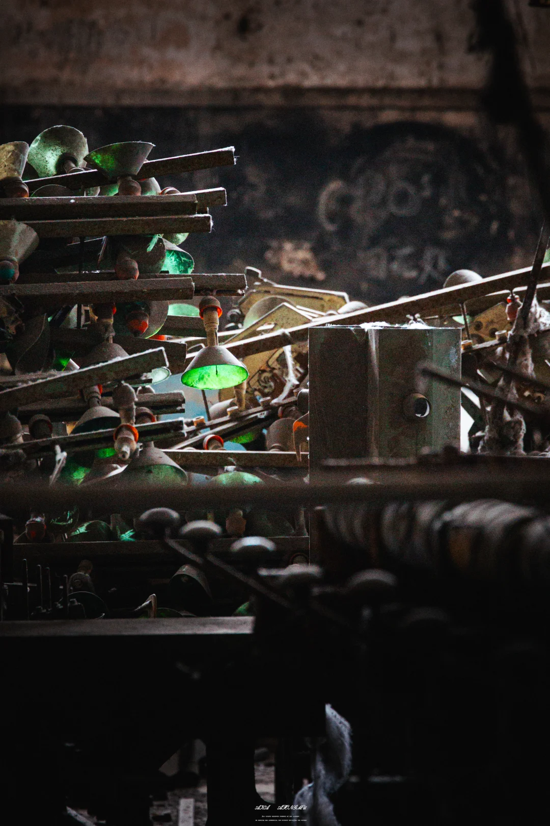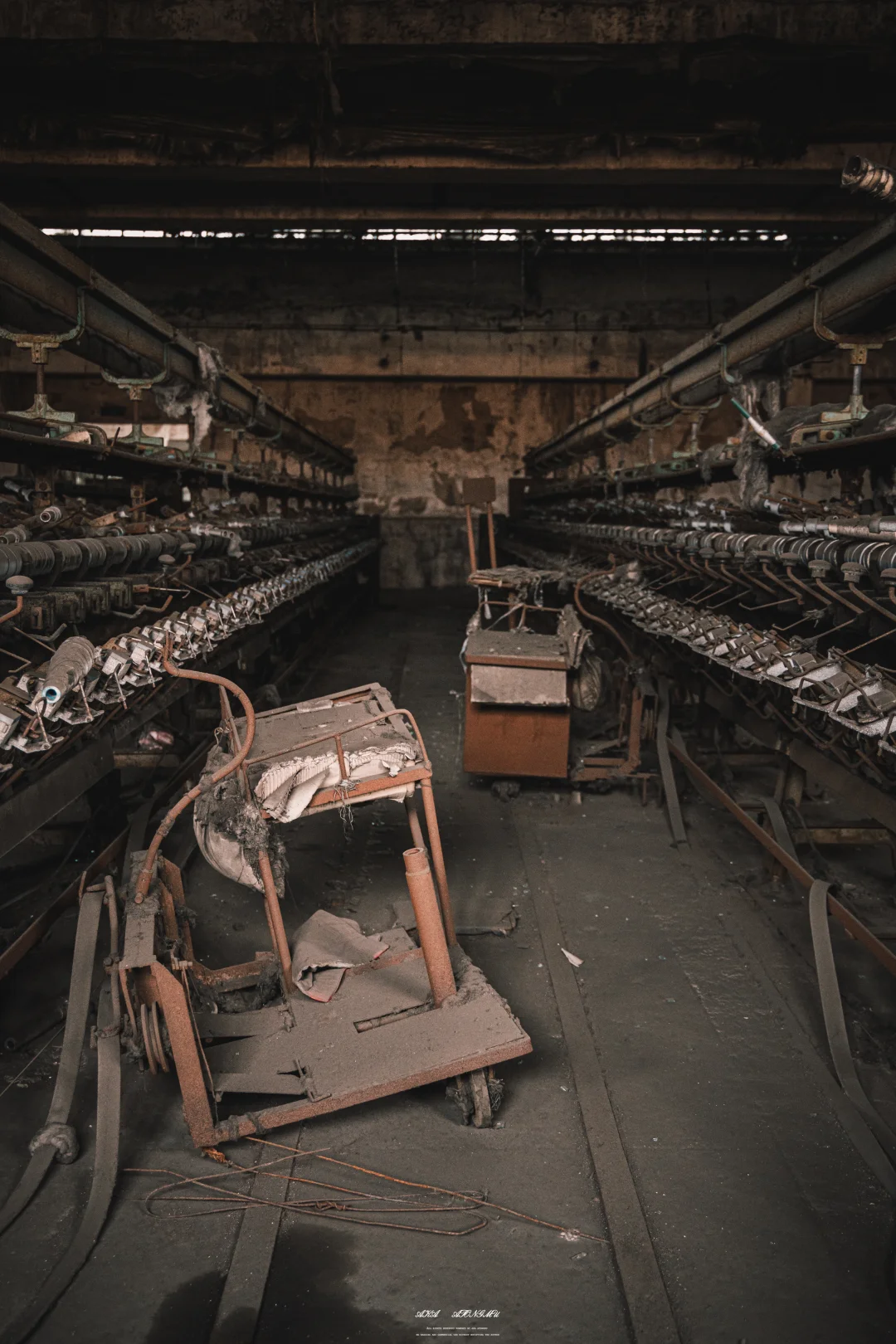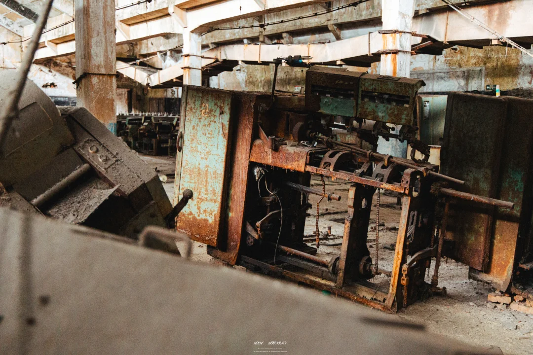 推开满是尘土的车间大门,成排的纺织机像列队的士兵,在阴影里陷入了永恒的沉默。那些绿色的操作手柄,曾经被无数双勤劳的手反复拨动,织出了多少家庭的生活。如今,棉絮落满了生锈的零件,只剩下光影在齿轮间游走。