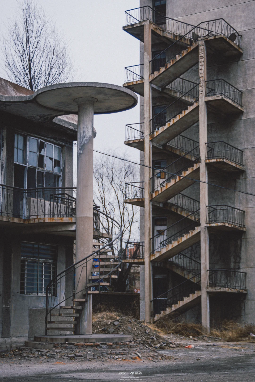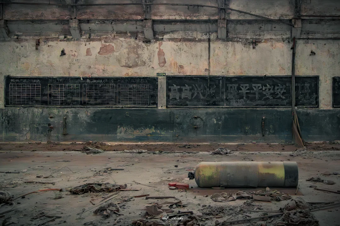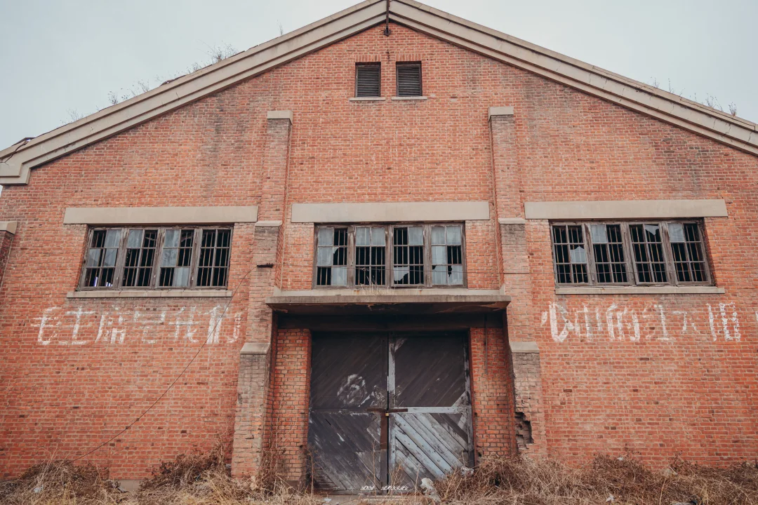 斑驳的红砖墙上,那句“全力推进主体民营化”的标语还没脱落,最有意思的是那座极具上世纪审美、带着旋转扶梯的小楼,虽然玻璃碎了大半,但依然能看出当年的洋气和体面。而车间大门上锈迹斑斑的“安全生产”四个大字,多少年了,还稳稳地压在半空中