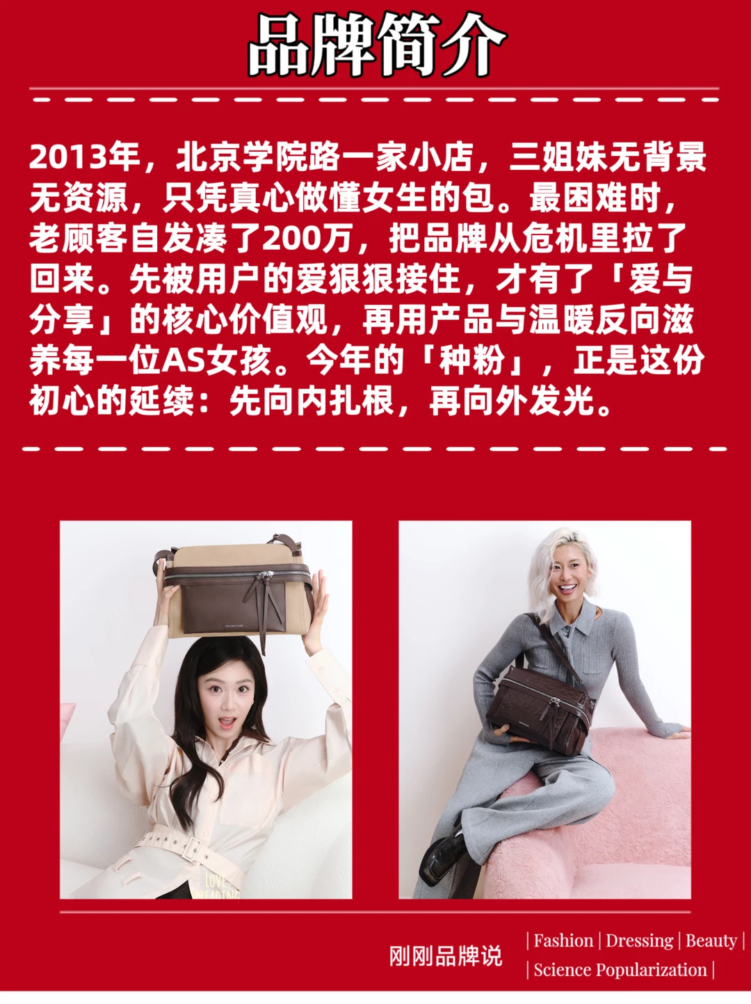 2013年,北京学院路一家小店,三姐妹无背景无资源,只凭真心做懂女生的包。最困难时,老顾客自发凑了200万,把品牌从危机里拉了回来。先被用户的爱狠狠接住,才有了「爱与分享」的核心价值观,再用产品与温暖反向滋养每一位AS女孩。今年的「种粉」,正是这份初心的延续:先向内扎根,再向外发光。
