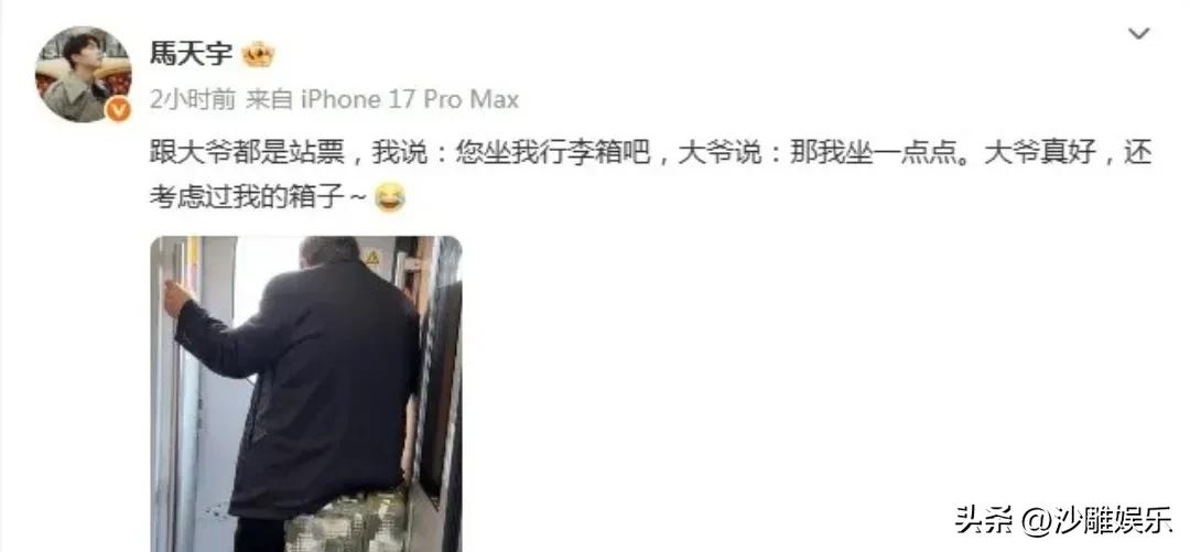 马天宇,深夜高调自夸! 3月9日深夜,马天宇这个名字悄然冲上热搜。这次不是新歌发布,也不是影视宣传,而是一段发生在高铁上的暖心小插曲,让网友直呼“又被圈粉了” 。 原来,马天宇当天乘坐高铁只买到站票。在拥挤的车厢连接处,他遇到一位同样无座的陌生大爷。看着大爷站得辛苦,马天宇主动挪过自己的行李箱,招呼大爷坐下歇歇脚 。 最戳人的是大爷的反应——他生怕坐坏了年轻人的箱子,小心翼翼地只轻轻坐了“一点点”,还念叨着别给人添麻烦。这份淳朴让马天宇都忍不住感慨:“大爷真好,还考虑过我的箱子” 。 事后马天宇在评论区沾沾自喜地自夸“人美心善”,这份毫不掩饰的真实反而让粉丝觉得可爱 。与其说是明星做善事,不如说是两个陌生人之间的双向体谅——大爷怕压坏箱子,马天宇心疼大爷久站。这种润物细无声的教养,比任何精心设计的人设都动人 。 网友热议 评论区的画风也是相当热闹: - “大爷那句‘坐一点点’直接给我整破防了,这是刻在骨子里的善良” - “马天宇自夸人美心善?行吧,这次我认了” - “他自己不说,谁知道他是马天宇?是那位大爷吗?” 这句灵魂反问瞬间点赞过万 - 当然也有个别声音质疑“过气明星炒作”,但立马被怼回去:“这种正能量炒作请多来点” 在这个流量为王的时代,真正能打动人的,往往就是这样不期而遇的温柔。无论是马天宇的随手善举,还是大爷小心翼翼的体谅,都让我们看到:即便在匆忙的旅途中,善良依然在悄悄流转 。