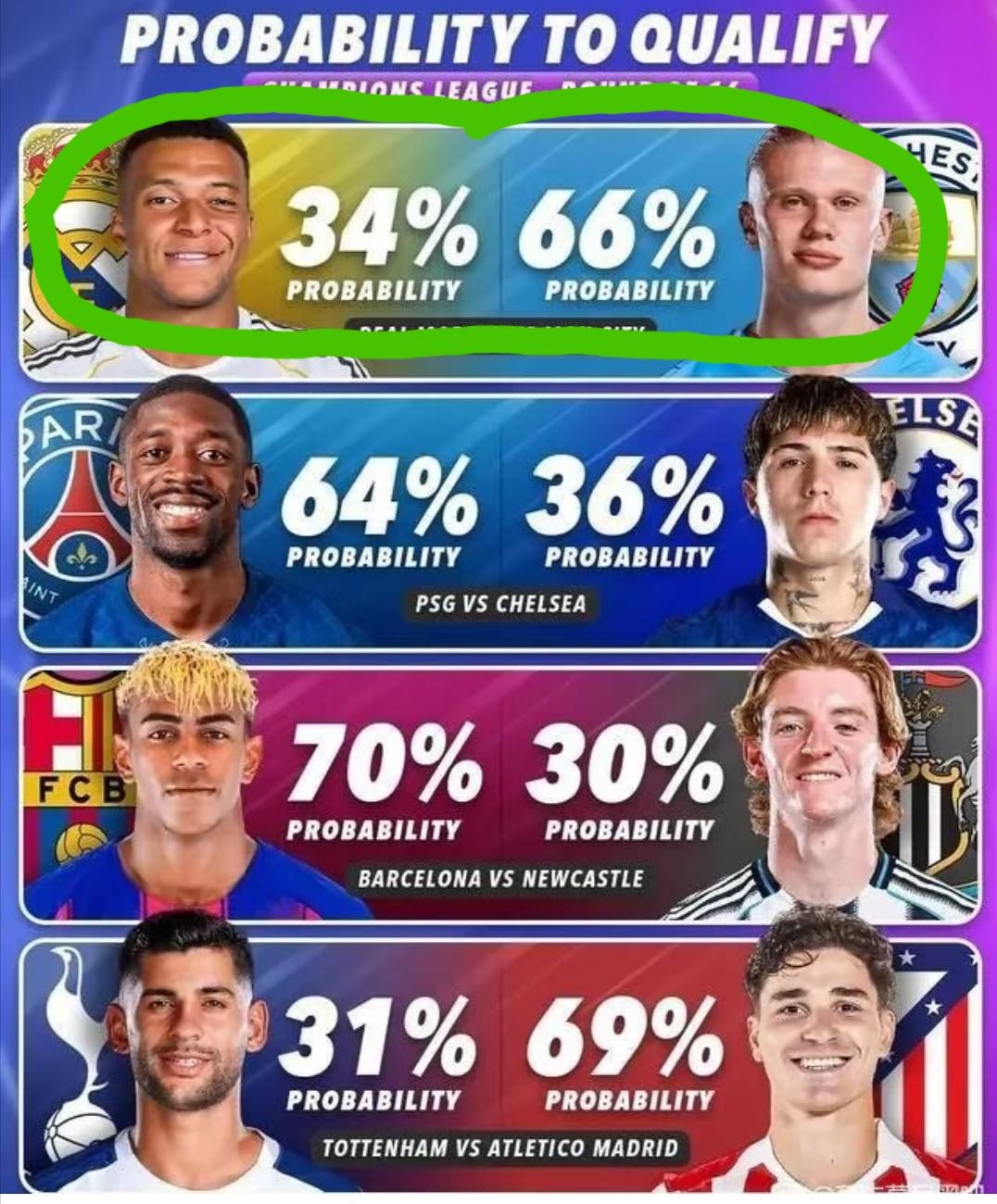 欧冠16进8各队的晋级概率,哈里凯恩领衔的拜仁最被看好,而皇马vs曼城这场比赛的晋级概率是1:2,皇马被普遍唱衰。 明晚皇马将主场迎战曼城,皇马主场能扛住曼城队犀利的进攻吗? 网上众多球迷都不看好,主要原因是皇马没有好的后卫,无论是阿拉巴、吕迪格还是阿诺德,都防不住哈兰德领衔曼城锋线的,明晚没有被灌进2个以上的进球说明皇马防守已经做的很好了!