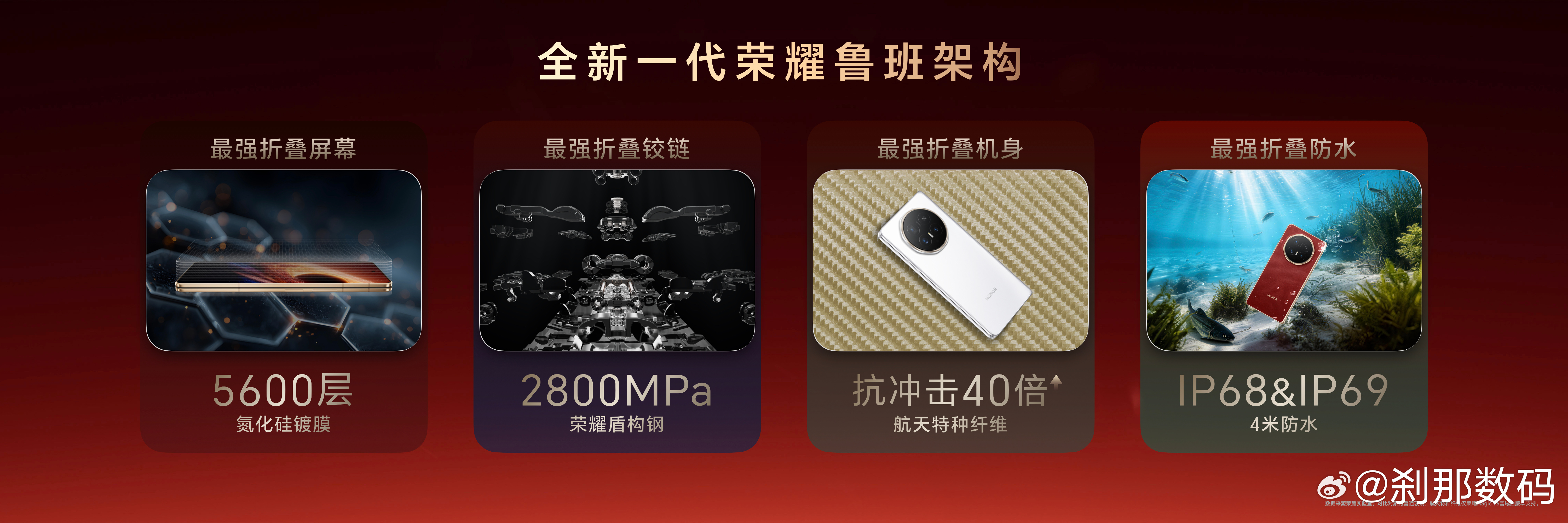 荣耀Magic V6 交待了几个核心硬件指标:防水级别: 4米深防水,同时拿到 IP68 和 IP69 认证(目前折叠屏里独一份)。铰链材质: 没用常规的钛合金,上了成本贵两倍的“盾构钢”,用的是飞机起落架同款锻造工艺。铰链强度: 抗拉强度飙到了 2800MPa。直白点说,这根轴硬到能直接拿去拉飞机。底层架构: 升级了新一代鲁班架构。荣耀Magic V6