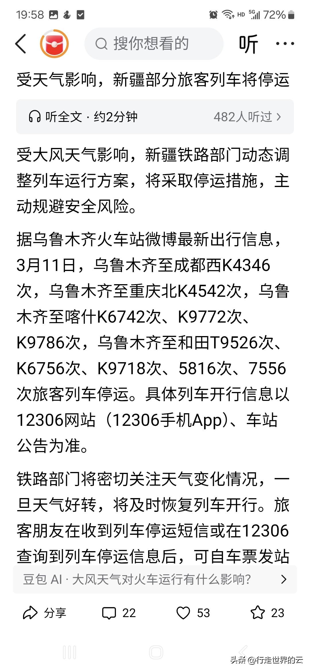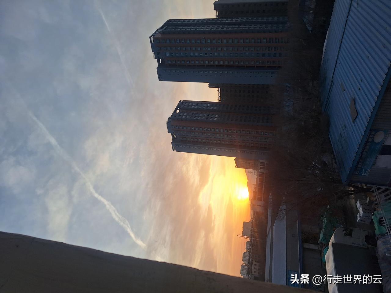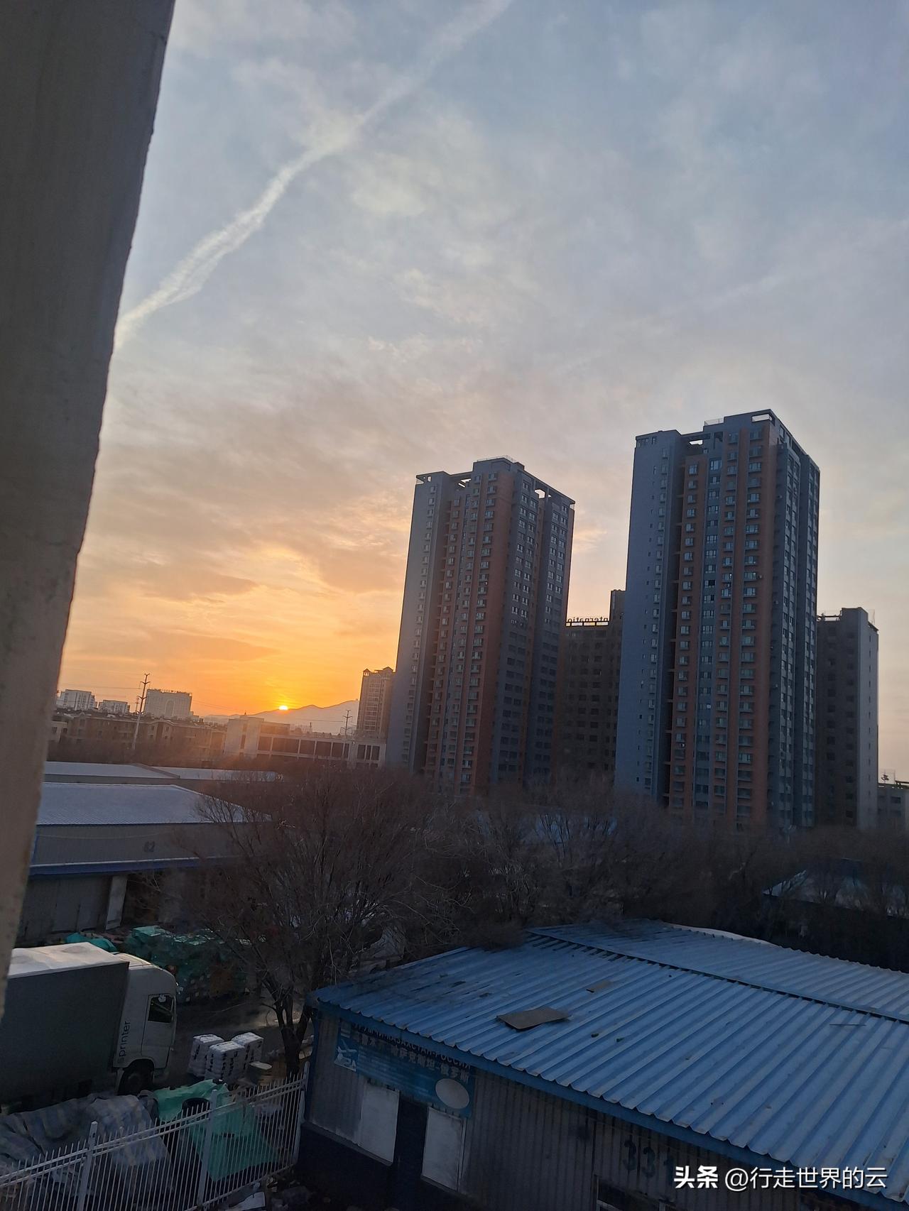 即将暴雪前的落日,多列火车停运,气象台发布暴雪蓝色预警。