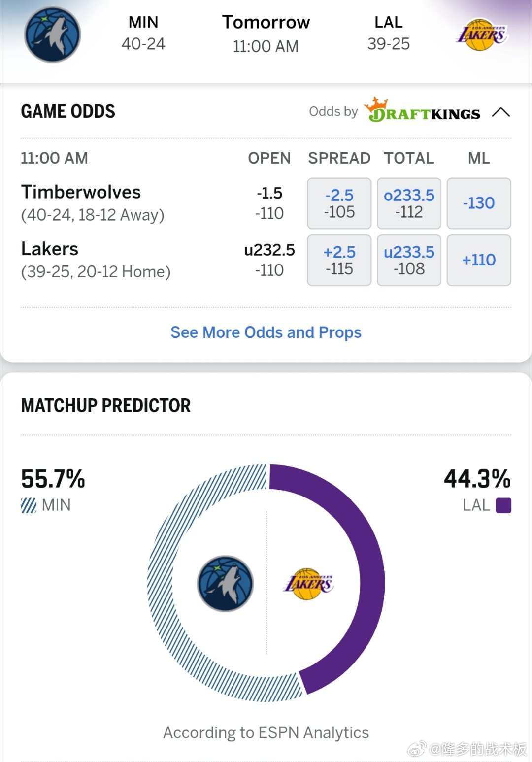 ESPN预测明日森林狼vs湖人胜率: 森林狼55.7%,湖人44.3%,比赛时间中午11点⏰