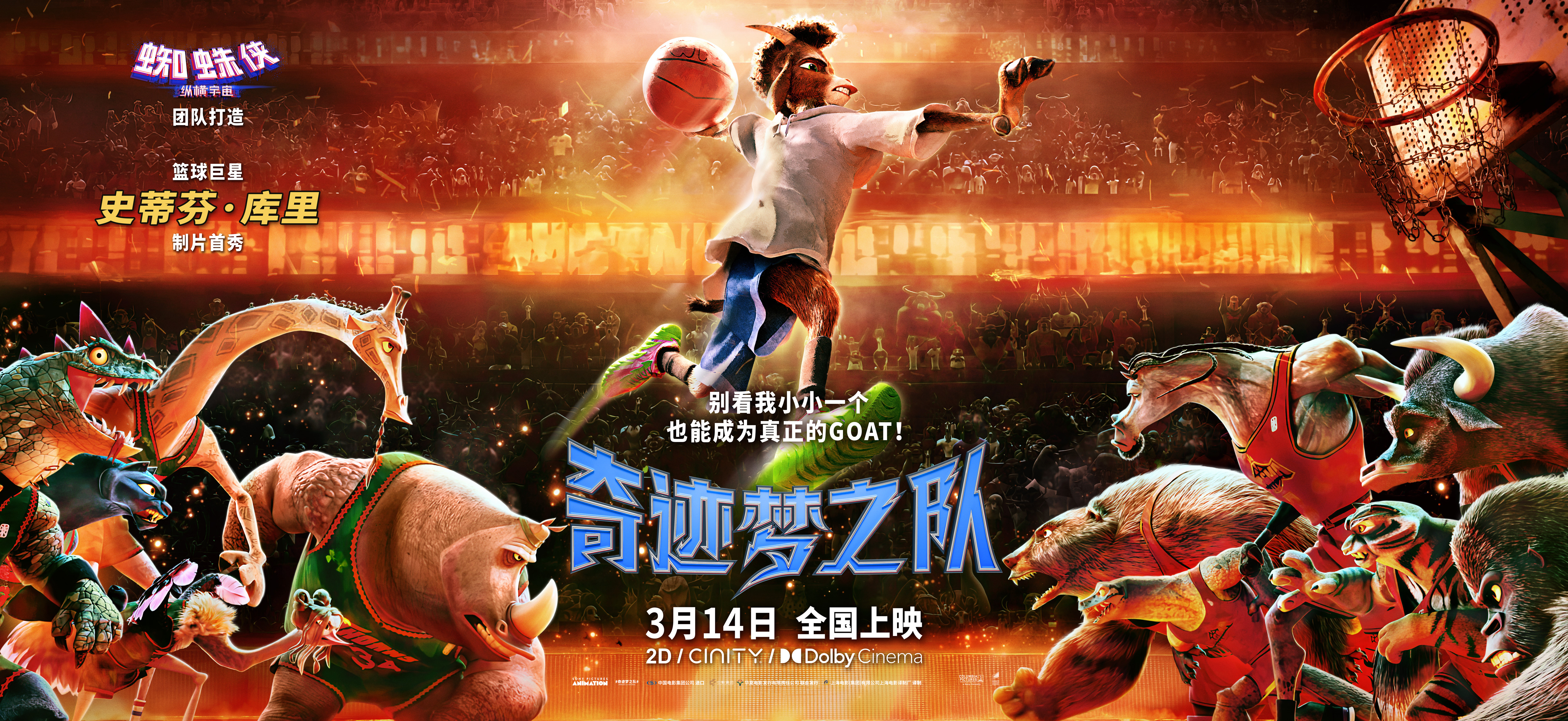奇迹梦之队 由美国哥伦比亚影片公司、索尼动画联合出品,开年最佳动画电影《奇迹梦之队》正式开启全国预售,全新中国独家预告及海报同步重磅释出!影片由篮球巨星史蒂芬・库里首度担任制片人,讲述了不被看好的小个子山羊威尔,与队友们逆风翻盘、书写赛场传奇的热血故事。影片定档3月14日库里生日当天上映,全国3000家影城同步打造专属生日庆典,邀千万观众共赴这场热血与团魂交织的银幕盛宴。全新中国独家预告燃情上线 问题球队逆袭点燃团魂全新发布的中国独家预告中,库里亲自邀观众共赴大银幕,与山羊威尔中文配音庞博携手拉开预售序幕。预告中,从被质疑“太矮小”的无名之辈,到震撼全场的传奇新秀,山羊威尔始终坚守热爱,以超凡球技打破偏见。并与偶像老将黑豹婕特并肩作战,带领一群“奇葩队友”,从最初的一盘散沙、赛季成绩垫底,到在威尔的感染下重燃斗志,彼此配合,共同迎战猛兽劲敌。全员凝聚超强团魂,让逆袭的剧本充满热血与感动,完美诠释了“不被看好,那就赢给你看”的赛场信仰。全新中国独家海报解锁巅峰对决 三千银幕共庆库里生日同步释出的中国独家海报,将影片的热血竞技氛围推至高潮。画面中,主角山羊威尔身着球衣腾空跃起,单手持球直冲篮筐,一往无前的少年意气扑面而来;画面下方,球队全员严阵以待,与对面的劲敌阵营形成对峙之势,全员集结的强大气场,将“团魂燃烧,势不可挡”的主题展现得淋漓尽致。影片自海外上映以来,便在全球市场掀起观影热潮,截至目前全球票房已突破 1.3 亿美金。更令影迷与球迷沸腾的是,影片3月14日上映当天恰逢史蒂芬·库里生日,全国 3000 家影城打造专属生日庆典,限时开启“库里生日”专属场次。观众购买带有专属标识的场次电影票,即可参与专属抽奖,亲签周边、限量球鞋、官方盲卡等硬核福利惊喜放送,让观影的同时,更能收获满满的庆生仪式感。从孤勇逐梦的山羊威尔,到并肩逆袭的奇迹梦之队,影片用鲜活的群像故事,诠释了赛场之上永不言弃的热爱与团魂,目前全球票房已突破1.3亿美金,成为当之无愧的2026开年最佳动画电影。《奇迹梦之队》由史蒂芬・库里首次担纲制片人,奥斯卡最佳动画《蜘蛛侠:平行宇宙》团队倾力打造,现已全面开启预售,3月14日全国影院上映。