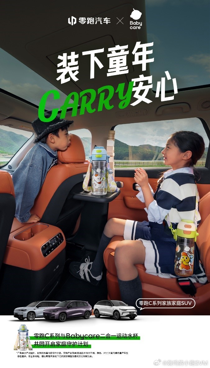 很多品牌讲家庭最后都停留在大空间、儿童座椅接口、车机看动画这些标准动作上。不过真正能让用户记住的,往往是那些看起来不大、却每天都会碰到的小细节。儿童运动水杯,就是这种存在。从这里看零跑和Babycare的联名,就对头了。生过娃的没有不知道Babycare吧……“安全”从车身结构、电池、座舱,继续往家庭日常用品延伸,还是能说明问题---零跑想要的,我觉得是想进入年轻家庭真实的生活半径里了。于是再想想零跑Lafa5,就很奇妙了。