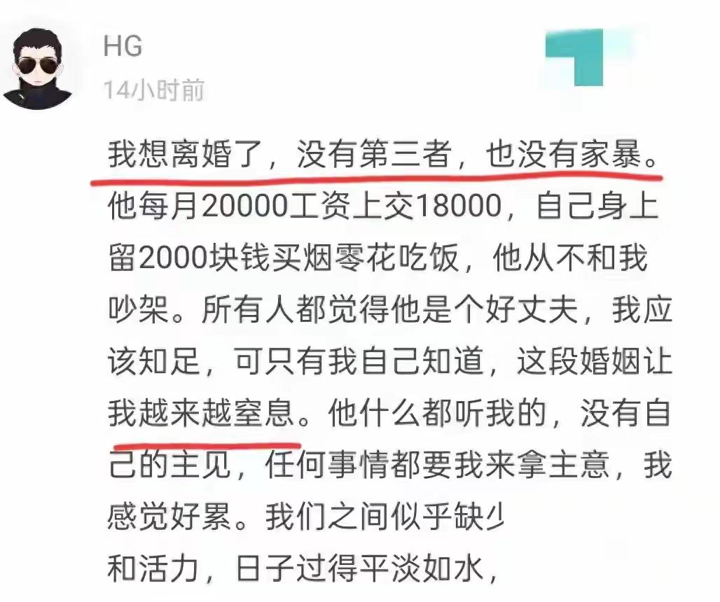 江苏无锡月入两万“模范丈夫”被离婚真相曝光:上交工资的“乖”背后,是婚姻里最残忍的冷暴力! 外人眼里,他是打着灯笼都难找的好男人。月薪两万,主动上交一万八,自己只留2千饭钱烟钱。不赌不嫖,脾气软得像棉花,说话从来温声细语。可就是这样的“完美丈夫”,却被妻子一纸诉状递到了民政局,铁了心要离婚。 不是出轨,不是家暴,理由简单得让人愕然:因为他太“乖”了。乖到家里所有事,小到晚餐菜单,大到投资理财,他都只会眨着眼睛说:“听你的。”妻子活成了这个家的“免费CEO”,心力交瘁。 婚姻里最可怕的,或许不是烽火连天的争吵,而是这种死水微澜的沉默。他把经济大权拱手相让,同时也把所有的责任与压力一并打包甩出。看似是尊重与信任,实则是精明的“责任豁免”。成了,是家运昌隆;错了,便是“当初可是你决定的”。 于是,那个看似被赋予无限权力的妻子,实际上被架在火上烤。每一次决策都在消耗她本就不多的心力,而那个本该并肩的伴侣,却安然坐在副驾,连导航都懒得看。婚姻这辆双人车,成了她一人的负重前行。 评论区早已撕裂。有人痛斥妻子“作精”,不懂珍惜;也有人深深共鸣,感同身受。老一辈的观念里,男人养家便是尽责。但新时代的婚姻,早已不再是简单的生存合伙,我们渴望的是精神上的同频与共担。 这种“乖”,本质上是一种情感的懒惰和退缩。他用顺从筑起高墙,隔绝了真实的沟通与碰撞。妻子所有情绪的拳头,都打在这堵柔软的墙上,无声无息,只剩更深的无力感。这不是包容,这是疏离。 更无奈的是,这种模式往往在无声中固化。一方抱怨对方不担当,可当对方真的尝试做主时,却又可能因不合己意而被指责。几次下来,“听话”就成了最安全的选择。婚姻陷入僵局,两人都满腹委屈,却无人能破。 表面和谐之下,是两颗逐渐冰冷的心。每月准时到账的一万八,成了这段关系最讽刺的纽带,捆绑着两个孤独的灵魂。离婚不是一时冲动,而是漫长窒息后的唯一呼吸。它揭开了一个残酷真相:现代婚姻的瓦解,往往始于内在能量的枯竭。 (来源: 根据网络热议话题及社交媒体平台讨论洵哥综合撰写) 婚姻冷暴力 情感共鸣