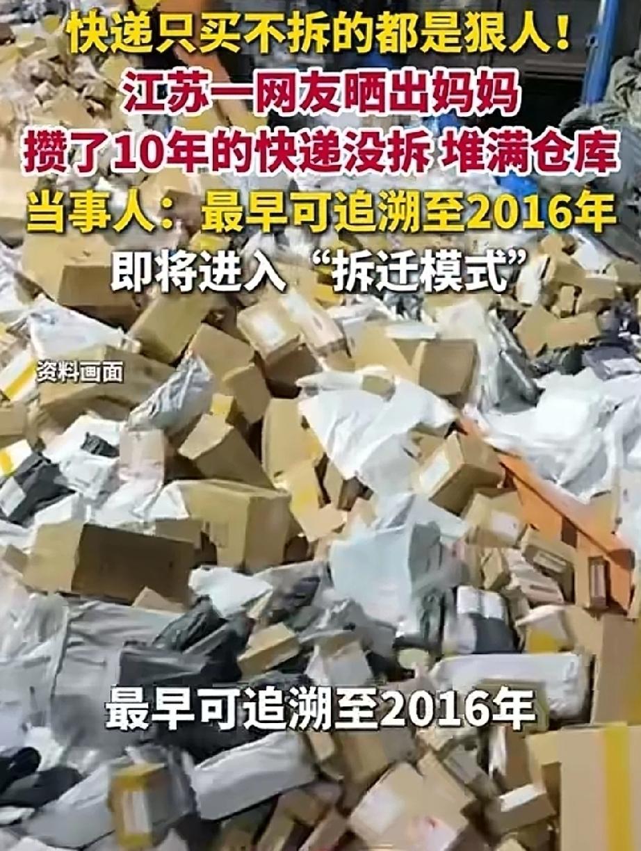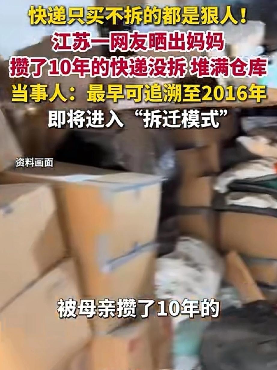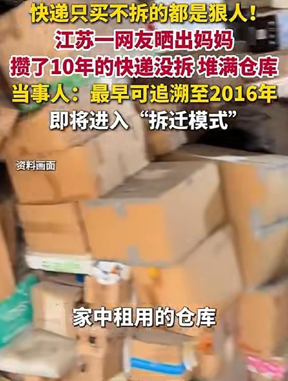 近日,江苏。房东要收回女子租下的仓库,老公和女儿齐上阵,帮助转移里面的物品。打开仓库一看,里面堆满了快递。纸箱子上标明了物品的名称,最早的纸箱子上的日期,是2016年。 10年来,女子不断的网购,只要是中意的,而不管是否有用,放一阵子再说。结果,东西越买越多,仓库都快堆不下了。 女子的老公看来极其宠爱老婆,哄老婆开心。也是他的最大的快乐?10年来,买了那么多无用的东西,也不说道说道。只要她开心就好。不过,这么多的快递,也够他父女忙的。 全家帮忙拆妈妈攒10年未拆快递宠妻老婆寄的快递 老婆就在宠