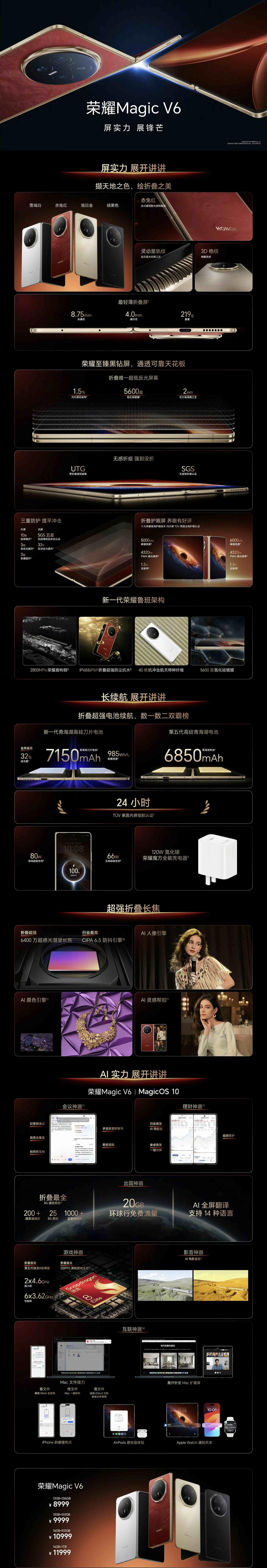 V6折叠屏发布,一共赤兔红、旭日金、雪域白、绒黑色4种配色,搭载第五代骁龙8至尊版旗舰芯片,首发搭载自研至臻黑钻屏,不仅护眼,在平整度、防摔、防反光、防磨都有明显突破,还通过了IP68&IP69防尘防水认证;整机轻至219g,展开厚度只有4.0毫米;影像方面,配备最强潜望长焦镜头,拥有6400万像素长焦,配合1/2英寸大底,CIPA 6.5防抖,暗光也清晰;续航为7150mAh大电池+120W闪充;还有MagicOS10众多AI功能,带来AI生产力全新升级。售价8999起,大家感觉如何?[灵光一闪]