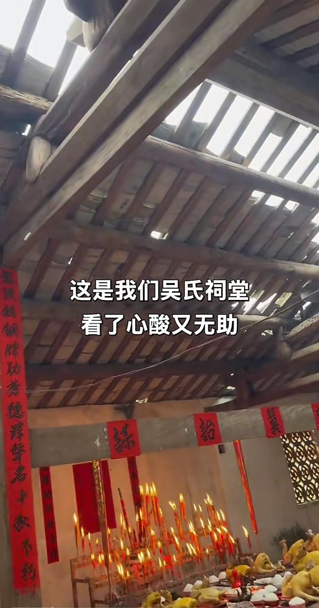 见过很多豪华又奢侈的祠堂,但第一次见到如此落魄又寒酸的祠堂。 我们不提倡迷信,但也不能对不住祖宗啊!说没后了吧,桌子上还摆了那么多只肥鸡,如果有后,为什么不集资修缮一下祖宗的祠堂呢?为何?