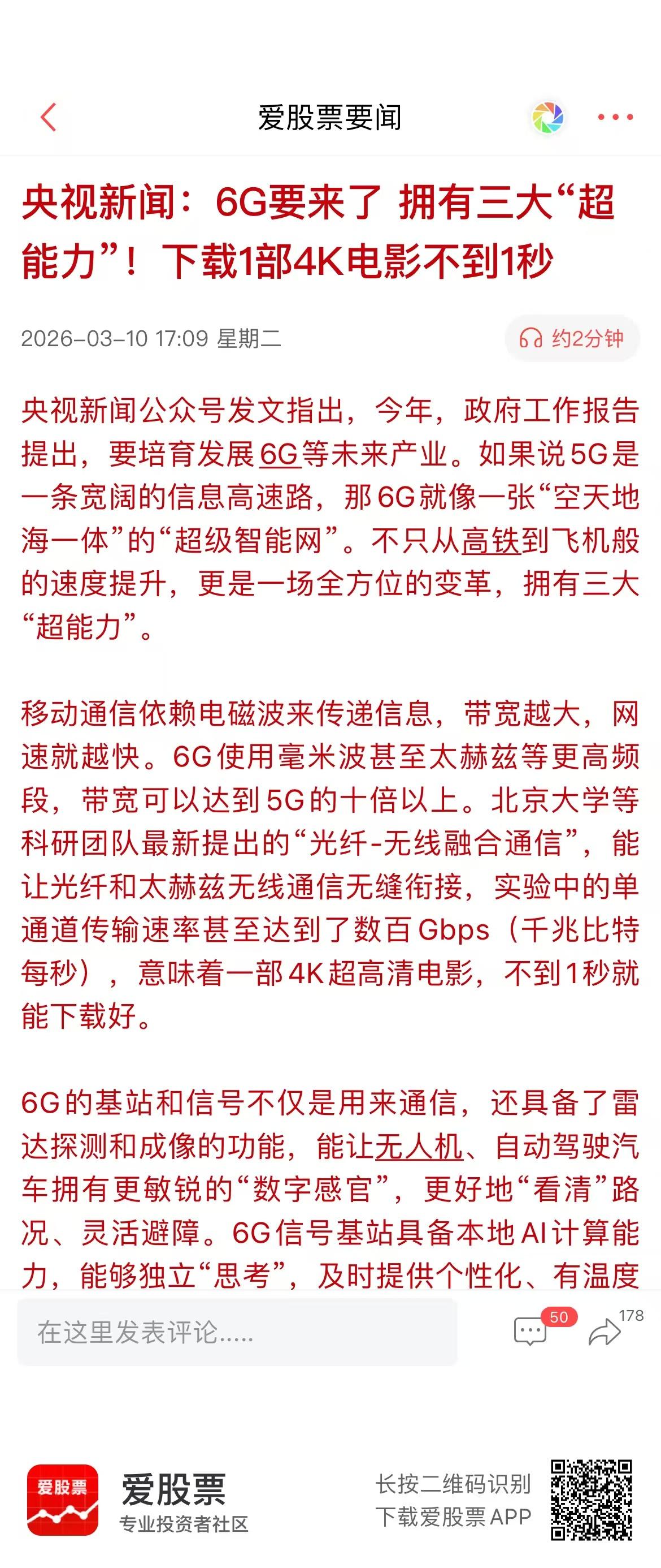 今天“6G网要来了”话题冲上微博热搜第一,6G概念股也闻风大涨! 6G作为《政府工作报告》中明确提出要培育发展的未来产业,也成为今年两会上比较热议的焦点。 6G到底是什么?爱股君认为,绝不仅仅是"更快的5G"。而是这三个特征,一是太赫兹通信(极速),二是空天地一体化(无死角覆盖),三是AI原生网络(可以智能调度)。 2025年被称为"6G标准化元年",可能过不了几年,6G将真正走进我们的生活!不过这个板块持续性难说,主要是商业化还有点远。