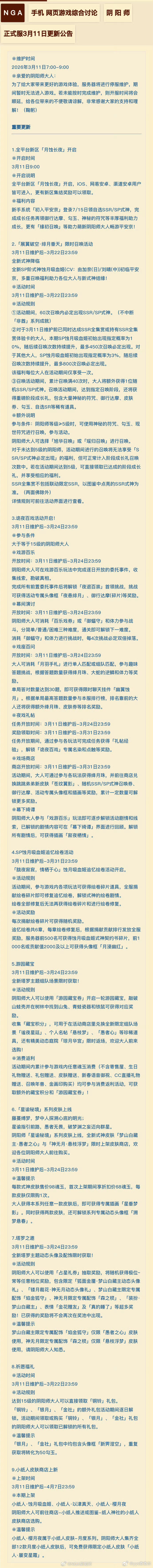 阴阳师手游超话创作官acg优创官 【正式服、体验服】3月11日,更新精简总结■sp吸血姬限时召唤up,3.11~3.22