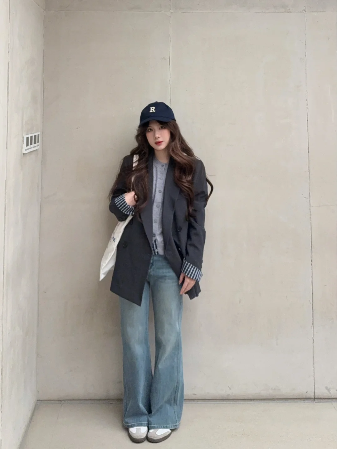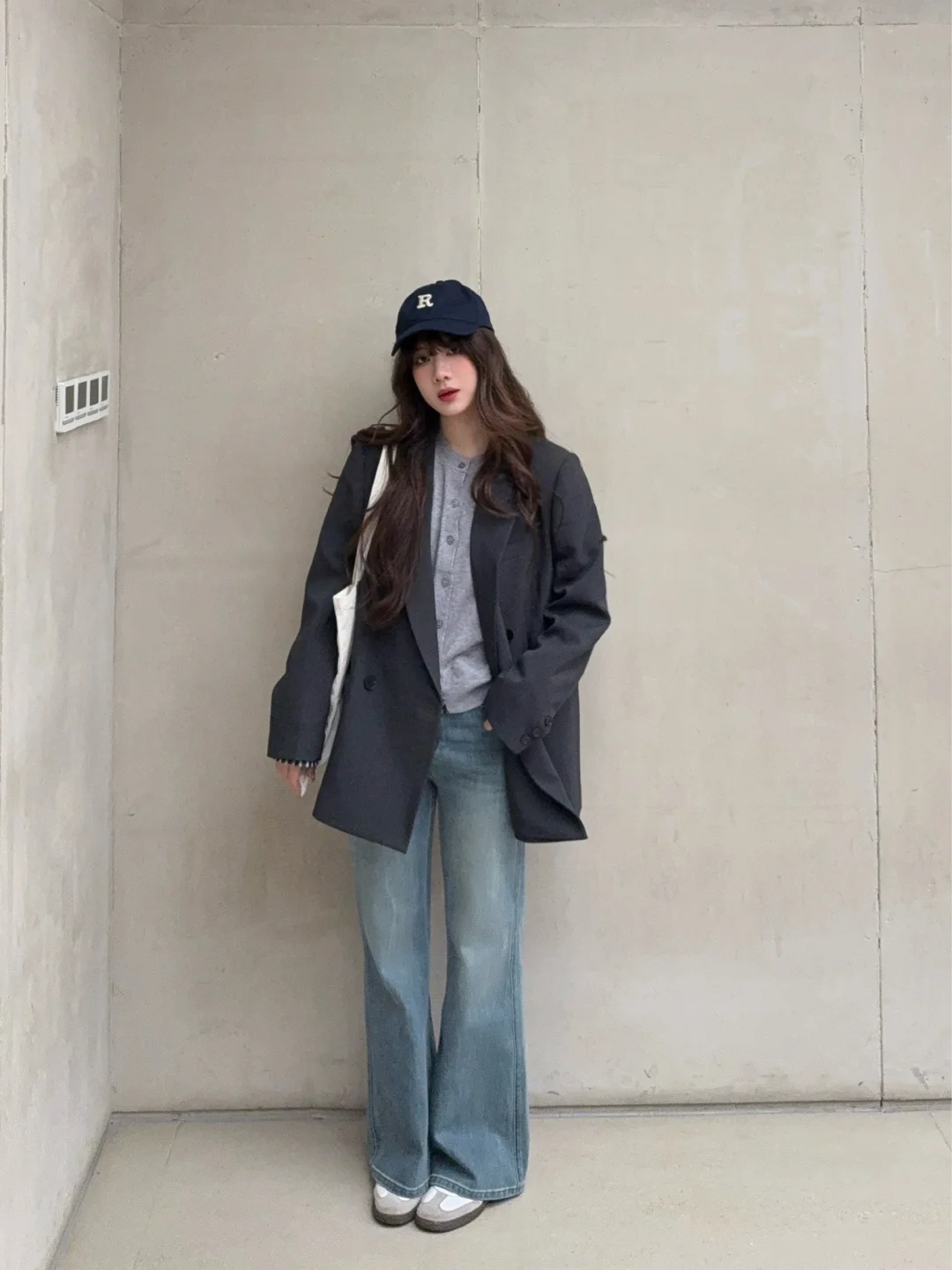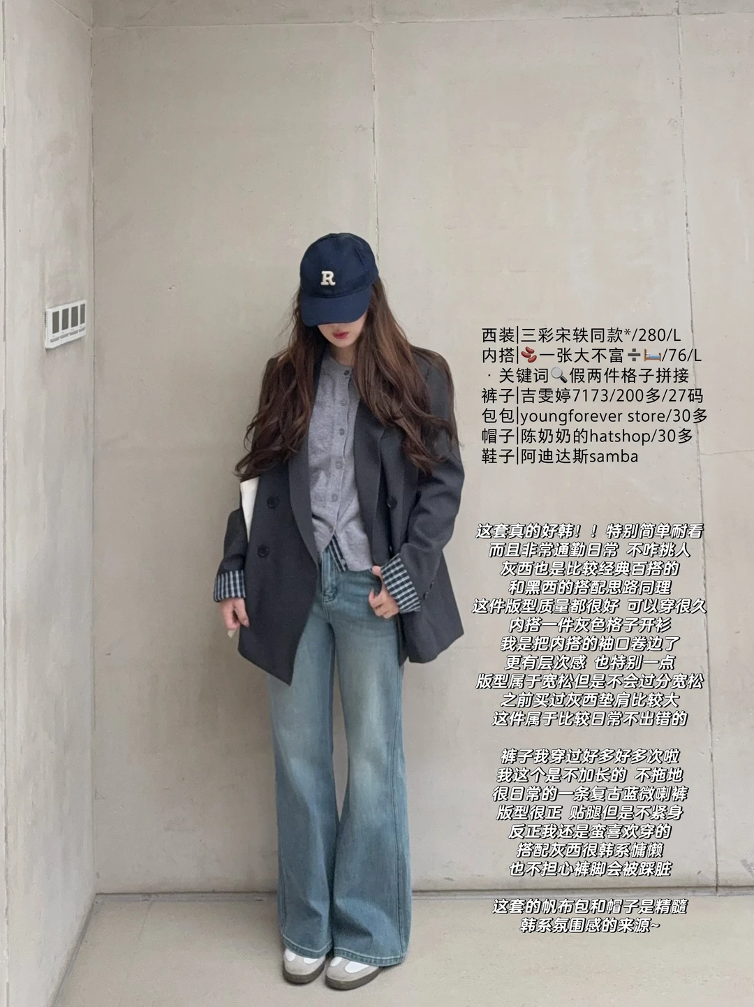 168/105 好喜欢这套!!单独发一下 灰色西装也搭配了一期穿搭思路 到时候会分享出来~ 灰西➕灰色开衫➕微喇裤➕德训鞋➕棒球帽 简简单单韩系氛围感~ 日常通勤都可以穿 很耐看又很舒适~ 美女感很强的一套 不费力就很好看 我很喜欢~