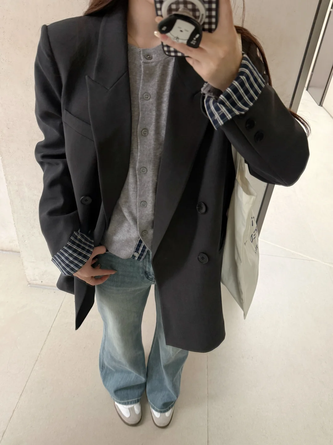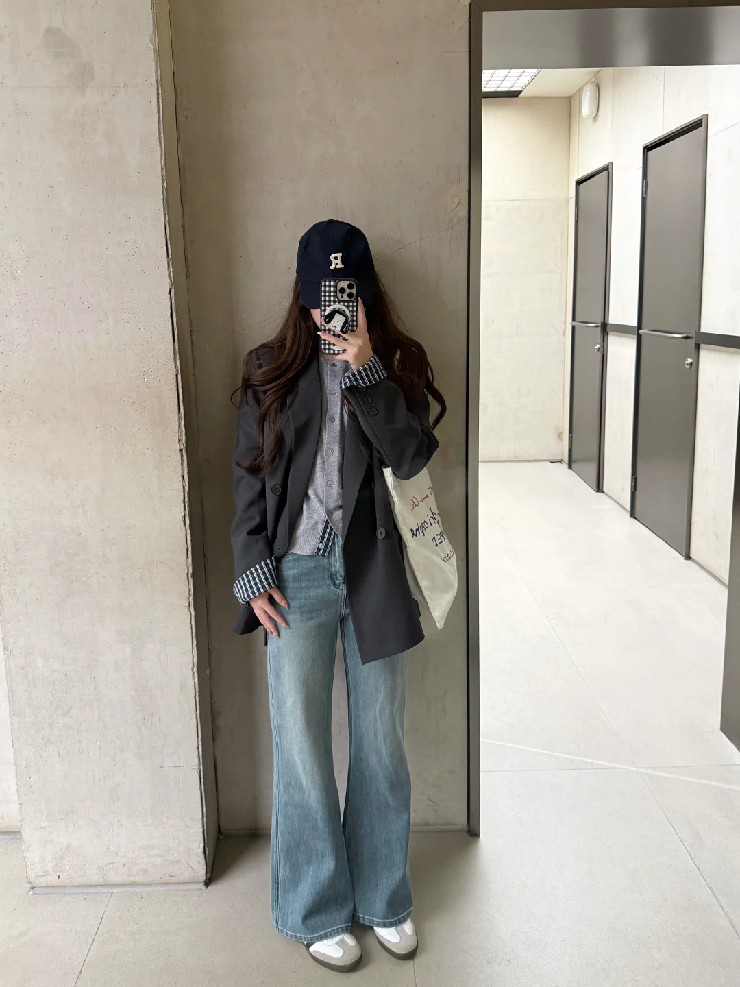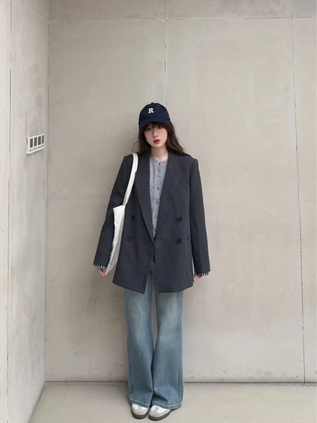 168/105 好喜欢这套!!单独发一下 灰色西装也搭配了一期穿搭思路 到时候会分享出来~ 灰西➕灰色开衫➕微喇裤➕德训鞋➕棒球帽 简简单单韩系氛围感~ 日常通勤都可以穿 很耐看又很舒适~ 美女感很强的一套 不费力就很好看 我很喜欢~