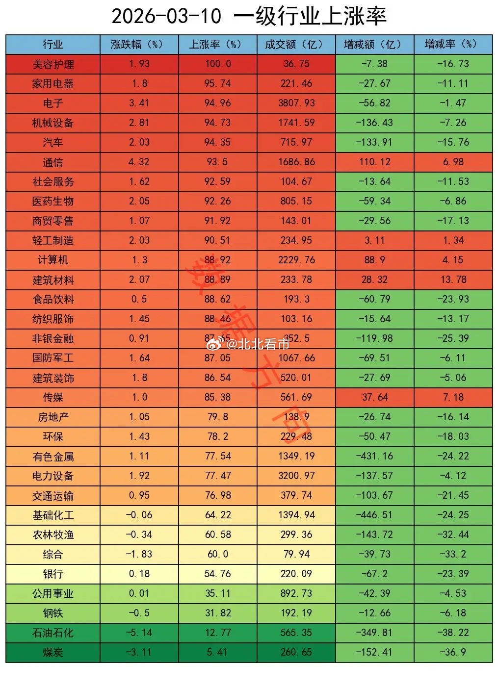 电子、通信,涨幅分别为3.41%、4.32%,个股上涨率都在93%以上,一起进入榜单前6名