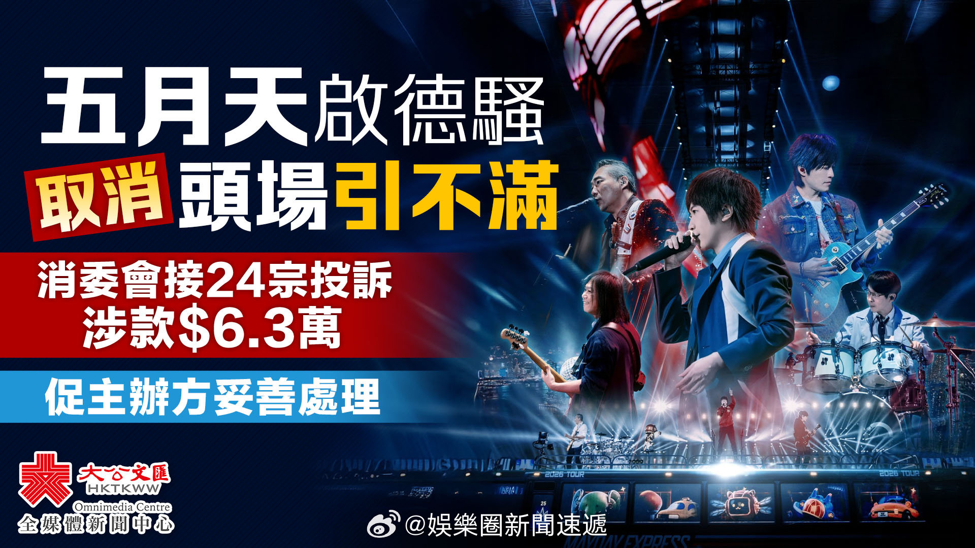 「啟德騷取消頭場引不滿…香港消費者委員會接24宗投訴涉款6.3萬 … 大公文匯全媒體報道,五月天 早前宣布3月24日、25日及3月27日、28日在啟德主場館舉辦演唱會,惟臨近開唱卻突然取消3月24日「頭場」演出,改期至3月29日「五月天出道日」加開新場次,引發歌迷不滿。消委會回覆傳媒查詢表示,截至今日(10日)下午1時,共接獲24宗相關投訴,涉款逾6.3萬港元,最高一宗為6700港元。