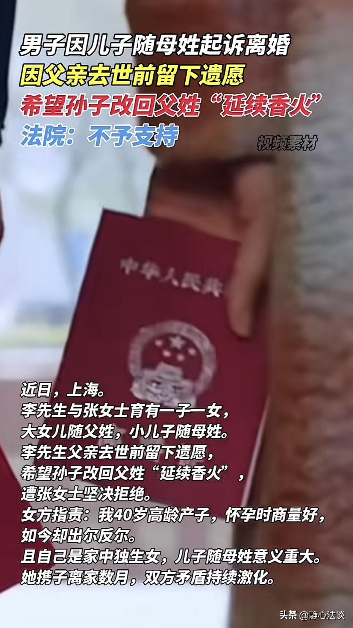 上海,男子父亲离世,留下遗言,要孙子改回父姓,不想断了根,男子便跟妻子商量,想要满足父亲的心愿,遭到妻子拒绝,当初怀孕的时候为了要孩子差点丢了半条命,你答应我,两个孩子一个随父姓一个随母姓,你现在为了一个已经离世的人,要改我儿子的姓,肯定不同意,一气之下带着儿子离开了家,男子见妻子态度坚决,直接翻脸:要么改姓,要么离婚! 2019年,40岁的张女士冒着高龄风险生下小儿子。 怀孕时夫妻俩就说好,大女儿已经随了父姓。 这个孩子不管男女,都跟妈妈姓,也算圆了她作为独生女的心愿。 那时李先生拍着胸脯保证都听媳妇的,觉得媳妇为了要这个孩子太遭罪。 后来李先生也说话算话,生完老二后,如愿跟了母姓,对妻子也很好,一家过也也算幸福。 可谁料,几年过后,李先生父亲重病,临终前留下了唯一的遗愿,就是把孙子的改回父姓,不能在这断了根。 从那以后,李先生开始变着法儿提改姓的事。 一开始是软磨硬泡,表示自己父亲走得不安心,就盼着孙子认祖归宗。 两个人起初也试过好好沟通,张女士表示姐姐跟你姓,弟弟跟我姓,两个孩子都好好的,这改不改都是你的孩子,有什么区别。 不管张女士说什么,李先生都不退让,就一句话,我家是男孩,必须随父姓。 张女士也懒得跟他理论,一口咬住就是不改。 李先生见妻子态度坚决,直接翻了脸,说她一个女人家,根本不懂什么是传 宗 接 代。 张女士气得浑身发抖,当初说的好好的跟我姓,现在拿没了的人压我。 我40岁生娃差点丢了半条命,你现在跟我讲香 火? 那段时间,家里的氛围很紧张,饭桌上没人说话,卧室里分床睡,连孩子哭都成了导火索。 张女士看着丈夫眼里的固执,突然觉得陌生。 那个曾经会在她孕吐时端热水,心疼她生产遭罪的人,怎么就变成了一个非要改姓的陌生人。 她终于忍无可忍,收拾行李带着儿子回了娘家。 一走就是三个月,这三个月里,李先生没打过一个电话问孩子好不好。 李先生在家也没闲着,他觉得妻子不理解他,实在忍不住了,就通知妻子,现在没有选择,要么改姓,要么离婚。 张女士听到这话,眼泪噼里啪啦往下掉,她想起怀孕时的艰辛。 那会孕反吃不下饭,半夜腿抽筋疼得直冒冷汗,生产时大出血差点下不了手术台。 她以为自己赌对了人,没想到最后要为了一句遗愿,赔上自己的婚姻和孩子的完整家庭。 更让她寒心的是,李先生真的把离婚诉状递到了法院。 法庭上,他表示自己一定要完成父亲的遗愿,儿子随母姓,就是断了我家的根。 而坐在对面的张女士表示,自己怀孕时他亲口答应孩子随自己姓,现在拿遗愿当挡箭牌,不过是想逼自己妥协。 她只问丈夫,你说你家的跟不能断,那我也是独生女,我家的根,就不是根了吗? 可当问到他们两人夫妻感情是否破裂的时候,李先生沉默了。 他能说什么?说因为妻子不肯改姓,所以感情没了?说父亲的遗愿比妻子孩子更重要? 最终只憋出一句她不肯改,就是不爱这个家。 法庭上,调解员看着档案里记载两人自由恋爱结婚,一起走过18年,育有两个孩子,至今仍住在同一个屋檐下。 所谓的矛盾,不过是围绕一个姓氏的执念。 而孩子需要父母共同关爱,李先生没能证明夫妻感情确已破裂,离婚诉求不过是逼迫对方改姓的手段,于法无据,于情不合。 最终判决下来:不予支持离婚。 消息传出来,有人骂李先生愚孝、大男子主义,也有人说张女士太固执?不为丈夫着想。 可没人能真正体会,那个40岁才生下儿子的母亲,在深夜里抱着孩子哭时的绝望。 她可能要的从不是跟谁姓的胜利,而是被尊重、被看见,是那个曾经许诺最爱你的人,能记得自己当初的承诺。 这场因姓氏而起的战争,看似以不准离婚收尾,可藏在背后的,是两代人观念的碰撞,是夫妻间信任的崩塌。 《民法典》第1015条:自然人应当随父姓或者母姓,但是有下列情形之一的,可以在父姓和母姓之外选取姓氏: (一)选取其他直系长辈血亲的姓氏。(二)因由法定扶养人以外的人扶养而选取扶养人姓氏。(三)有不违背公序良俗的其他正当理由。少数民族自然人的姓氏可以遵从本民族的文化传统和风俗习惯。 也就是说子女既可随父姓、也可随母姓,父母享有平等决定权,无必须随父姓的强制规定。 张女士的孩子随母姓是当初双方协商一致的结果,合法有效,老人遗愿不具有法律强制力,不能单方推翻此前约定。 对此,你觉得到底是要一个跟父亲姓的名字重要,还是要一个温暖完整的家重要! @静心法谈 学法辨是非,慬法不吃亏!