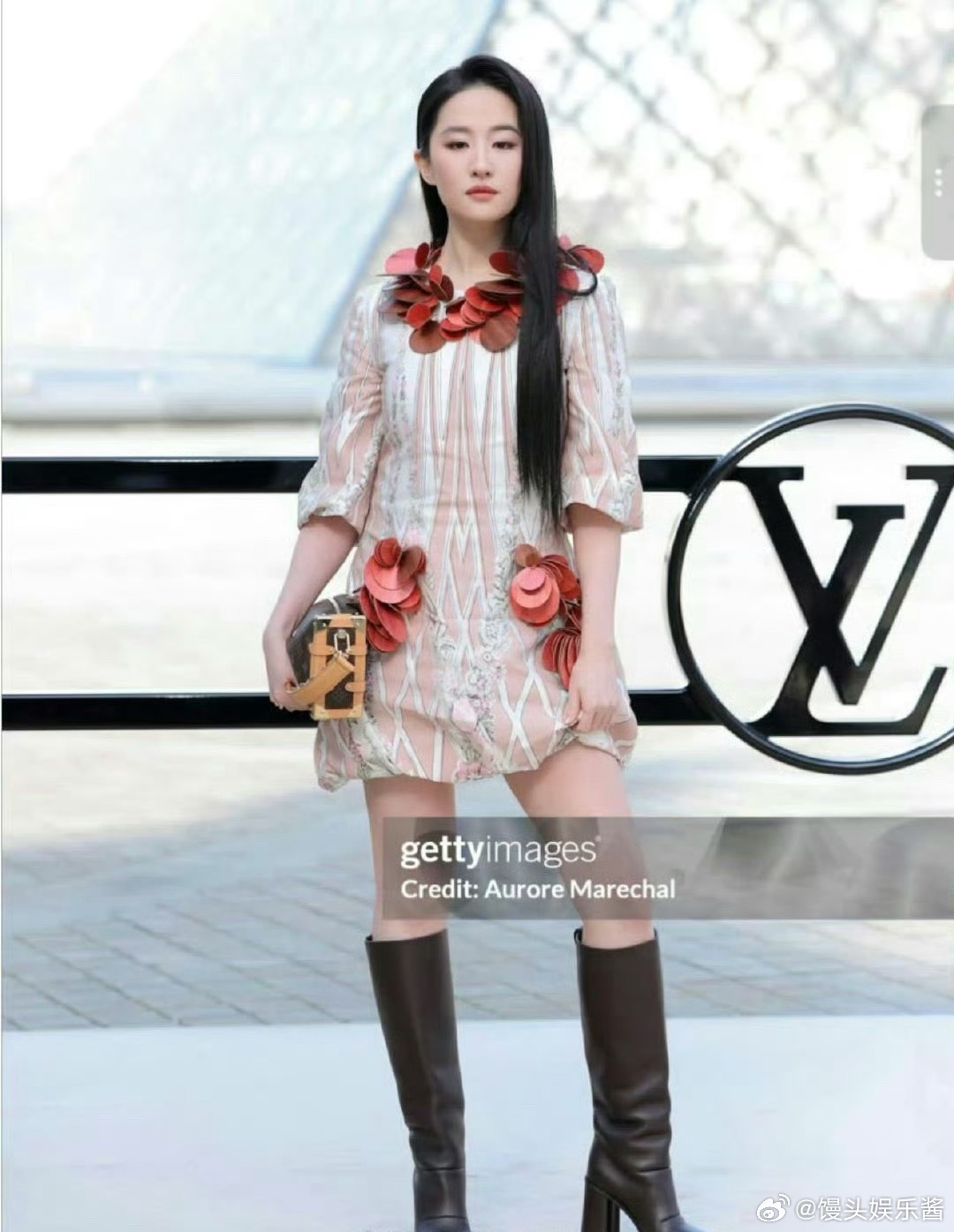 同是LV代言人,这次巴黎大秀的造型口碑差了十万八千里。刘亦菲穿粉白条纹印花