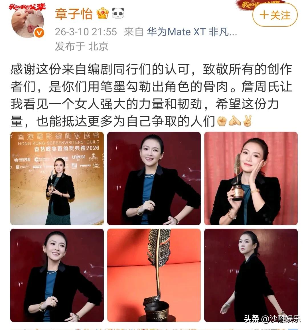 章子怡,深夜激动发文! 3月10日夜晚,当大多数人已经进入梦乡,章子怡却辗转难眠。这位见惯了大风大浪的国际影后,居然像拿到糖果的小女孩一样,迫不及待地在社交平台分享了自己的好消息 。 “感谢这份来自编剧同行们的认可,致敬所有的创作者们,是你们用笔墨勾勒出角色的骨肉。” 字里行间那份真诚的激动,快从屏幕里溢出来了 。 原来,她获得了香港电影编剧家协会的最佳电影角色奖。不是最佳女主角,而是“最佳电影角色”——这个奖项的微妙之处在于,它肯定的不只是演员的演技,更是角色本身的生命力 。 这个角色,就是《酱园弄·悬案》里的詹周氏 。 说起这个角色,章子怡可是“吃了大苦头”。46岁的她,主动剃掉了眉毛,脸上贴满疤痕,戴上畸形的牙套,把自己从光鲜亮丽的“国际章”变成了一个被生活碾碎的底层妇女 。 有网友评论:“这不是演技,这是把自己拆碎了重新拼成另一个人。” 为了演好这个民国时期杀夫分尸的绝望女人,她减重到80斤,学裹小脚走路,甚至主动要求真扇耳光——就为了让脸肿起来更真实 。片场凌晨,她戴着金属牙套导致口腔溃烂,却还在琢磨詹周氏的眼神该往哪里躲 。 网友说:“看她演詹周氏,我忘了她是章子怡。那双眼睛里全是麻木和绝望,哪还有半点影后的影子?” 有趣的是,《酱园弄》本身并非没有争议。豆瓣评分不算亮眼,剧情剪辑被吐槽“稀碎”,甚至有人质疑这是“烂片” 。 但就是在这样一部争议之作里,章子怡的表演却成了唯一的“定海神针”。这次获得编剧协会的认可,恰恰说明了一个朴素的道理:内行看的是门道。 编剧们最懂什么?最懂角色有没有“立住”。詹周氏这个在动荡年代独自撑起家庭、不向命运低头的女人,被章子怡演出了骨血 。那种挣扎与坚守,不是靠脸谱化的表演,而是靠每一个细微的颤抖、每一次欲言又止的眼神。 有网友毒舌:“有些人演了一辈子戏,演的还是自己;章子怡演詹周氏,你连章子怡在哪儿都找不着。” 仔细想想,章子怡这两年的经历,何尝不是另一个版本的詹周氏? 2023年离婚后,不少人等着看她的笑话:44岁带俩娃,还能翻出什么浪花? 结果呢?她扎进《酱园弄》的片场,用最笨的办法打磨角色,把自己弄得“面目全非” 。2025年下半年至今,金莲花奖、金像奖提名、再到这个最佳电影角色奖,她用一座座奖杯堵住了所有的嘴 。 网友神评:“汪峰的新歌没人听,章子怡的新奖拿不停。这才是真正的‘分道扬镳’——一个往上走,一个往下滑。” 另一位网友说得更扎心:“有些人离婚是人生滑铁卢,章子怡离婚是人生重启键。” 说实话,这些年各种颁奖礼看多了,观众早就审美疲劳。但这次章子怡的获奖感言里有一句话特别打动我: “詹周氏让我看见一个女人强大的力量和韧劲,希望这份力量,也能抵达更多为自己争取的人们。” 她没有把奖杯当成炫耀的资本,而是当成一种传递。传递什么?传递一种信念:无论生活把你踩得有多低,你都可以爬起来,哪怕满身泥泞。 46岁的章子怡,经历了巅峰、争议、婚姻、离婚,如今站在领奖台上,眼里没有得意,只有对角色的敬畏 。这种状态,比任何奖杯都珍贵。 正如一位网友所说:“章子怡用詹周氏告诉我们:女人不是被命运定义的,女人是改写命运的。” 恭喜章子怡。也谢谢詹周氏——让我们看到了一个女人最坚硬也最柔软的模样。