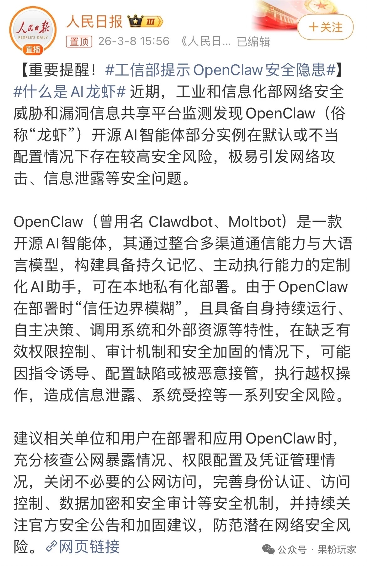 随着AI龙虾爆火,继工信部发布高危风险预警后,3月10日,官方再就“龙虾”发布提醒,国家互联网应急中心发布“关于OpenClaw安全应用的风险提示”。反诈连连看